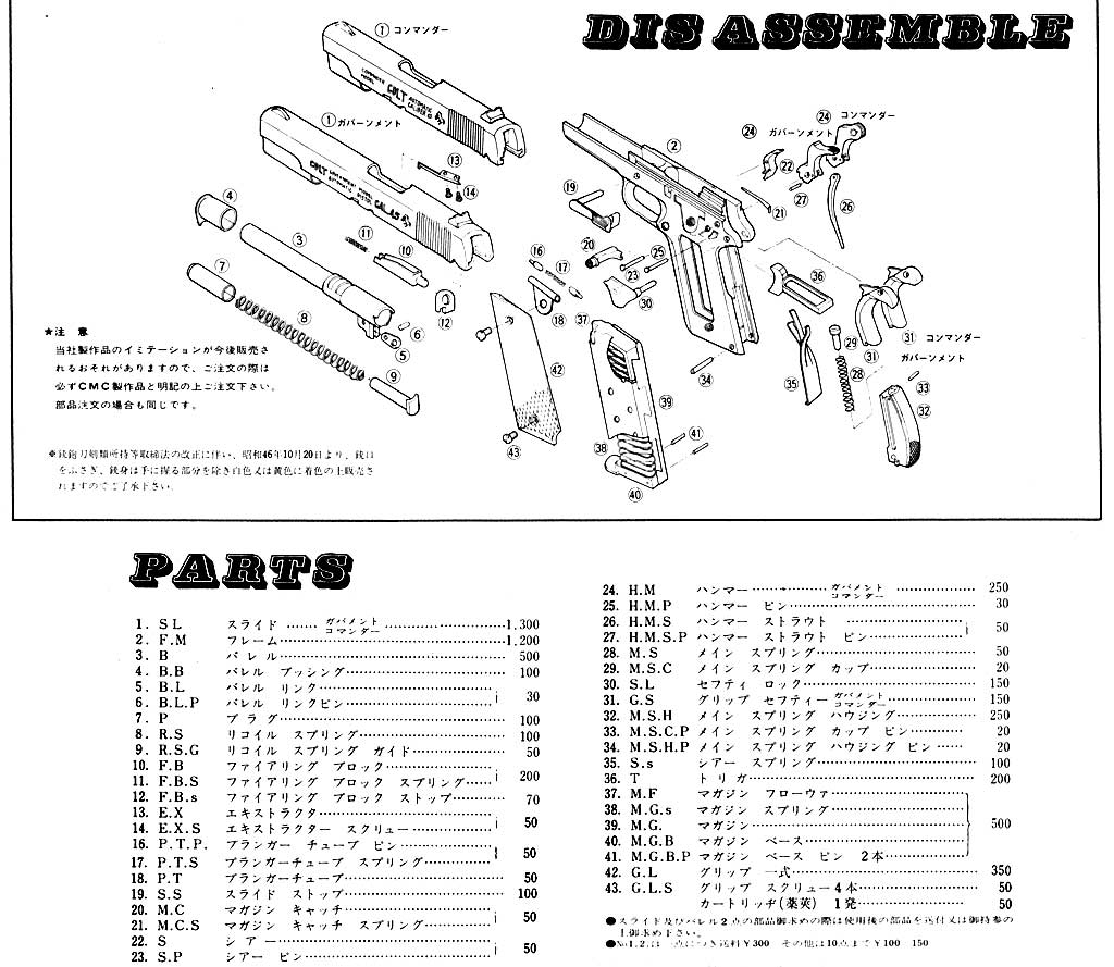 ![]() CMC2型と言っても外観は1型と同じです。1型は発火機構が無くてマガジンが 9mm口径ガバのように細いそうです。 このガバメント登場までマテルを手本としたSAA を造っていた江原商店はCMC と社名を変更します。 1965年のブローニングの乱による業界分裂もきっかけだったのではないかと思います。