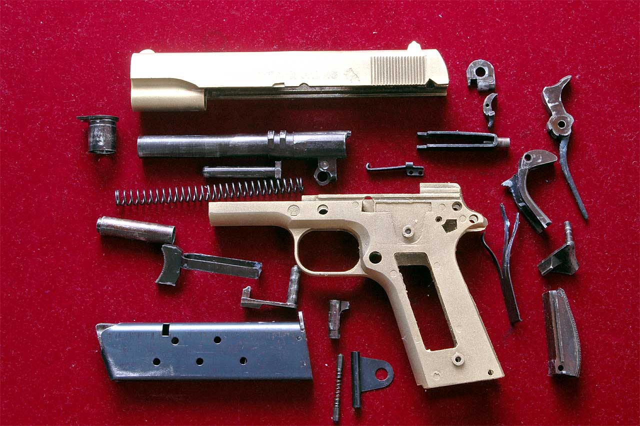 ![]() プランジャー部分も製造優先で鉄プレスの独特な形状ですが、これも両者同じ作りです。このような珍しい形式を2人の設計者が同時に考案するとは思えませんので、どちらかが参考にした物だと思います。(あとで判ったのですが、CMC がマガジンキャッチ方式ともに真似したものです。CMC 1型ガバは形状が違います) この形式から実物同様なプランジャー部を持つ金属モデルガンの登場は、相次ぐ規制により30年近くも待たなければなりませんでした。ホビーフィックスのガバメントがそれです。日本で唯一のプレス部品を脱ぎ捨てた金属ガバです。