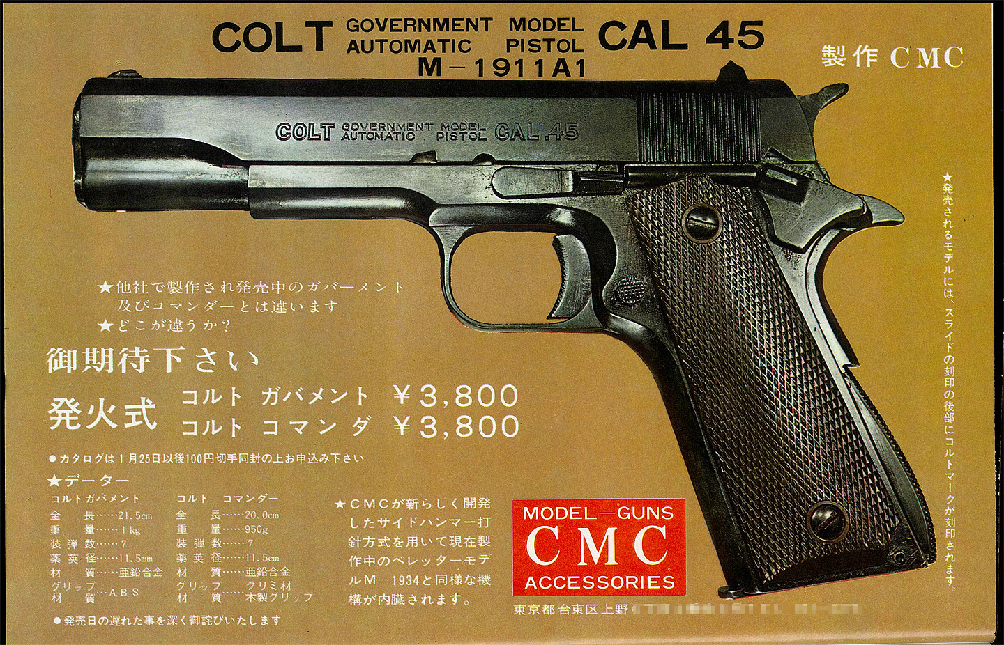 ![]() お互いに意地なのか、単なる偶然なのか、ほぼ同時にMGC からもガバメントが発売されています。それは、発火できるモデルでした。CMC も負けじと1年後に発火タイプを発売します。それがこのページで紹介する世間で2型と呼ばれている物です。