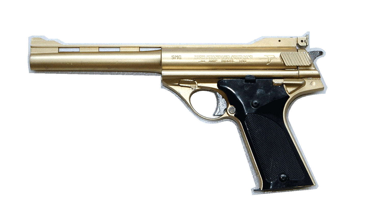 ![]() これは、ハイスタンダード刻印の実銃です。小さく浅い刻印のようです。 アメリカ在住のYoshi さんのページ から了解を得て借りています。