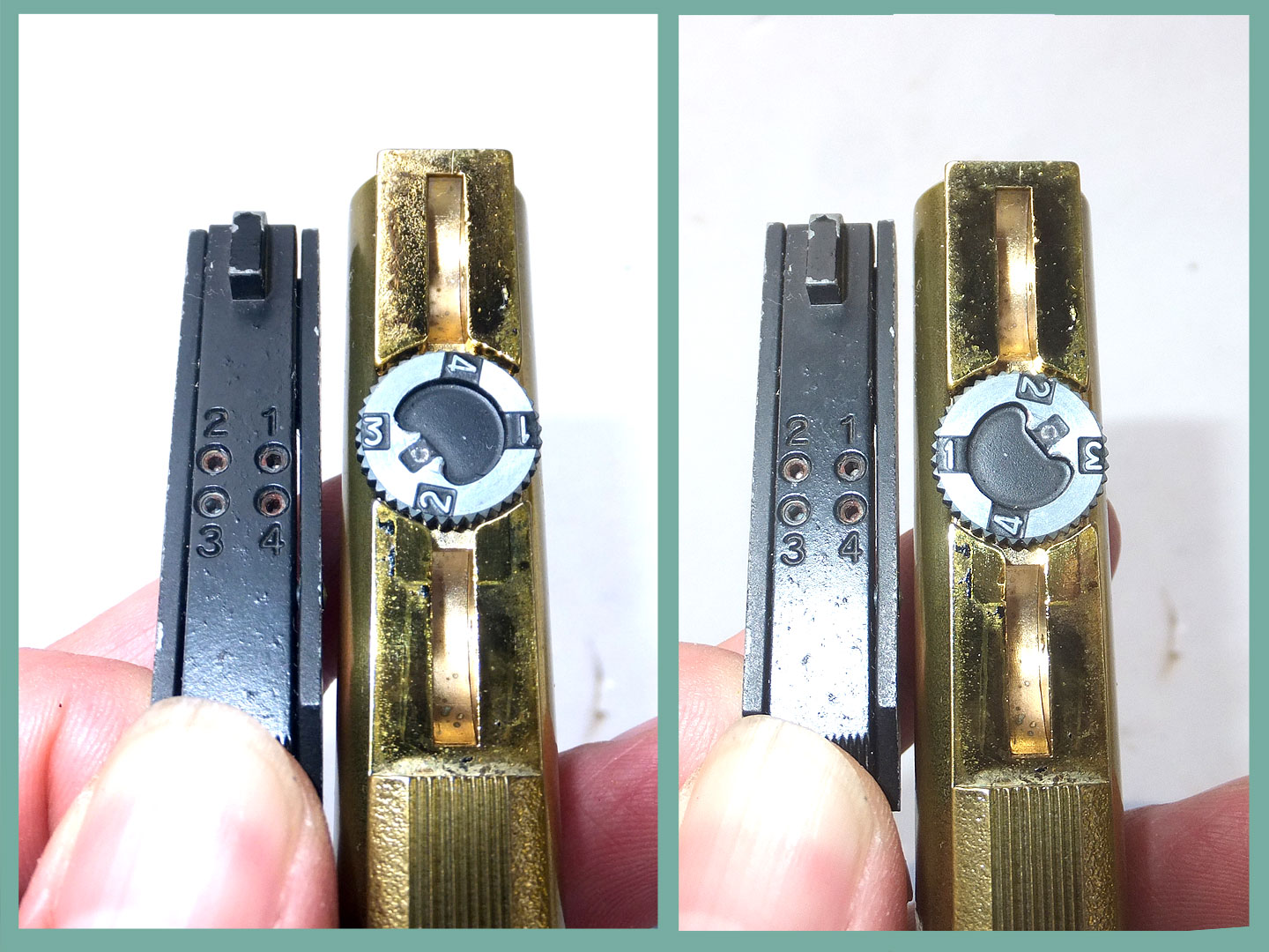 右写真のように1番が見えているときにいは、1番のイモネジに当たります。フロントサイトには棒状のバネで