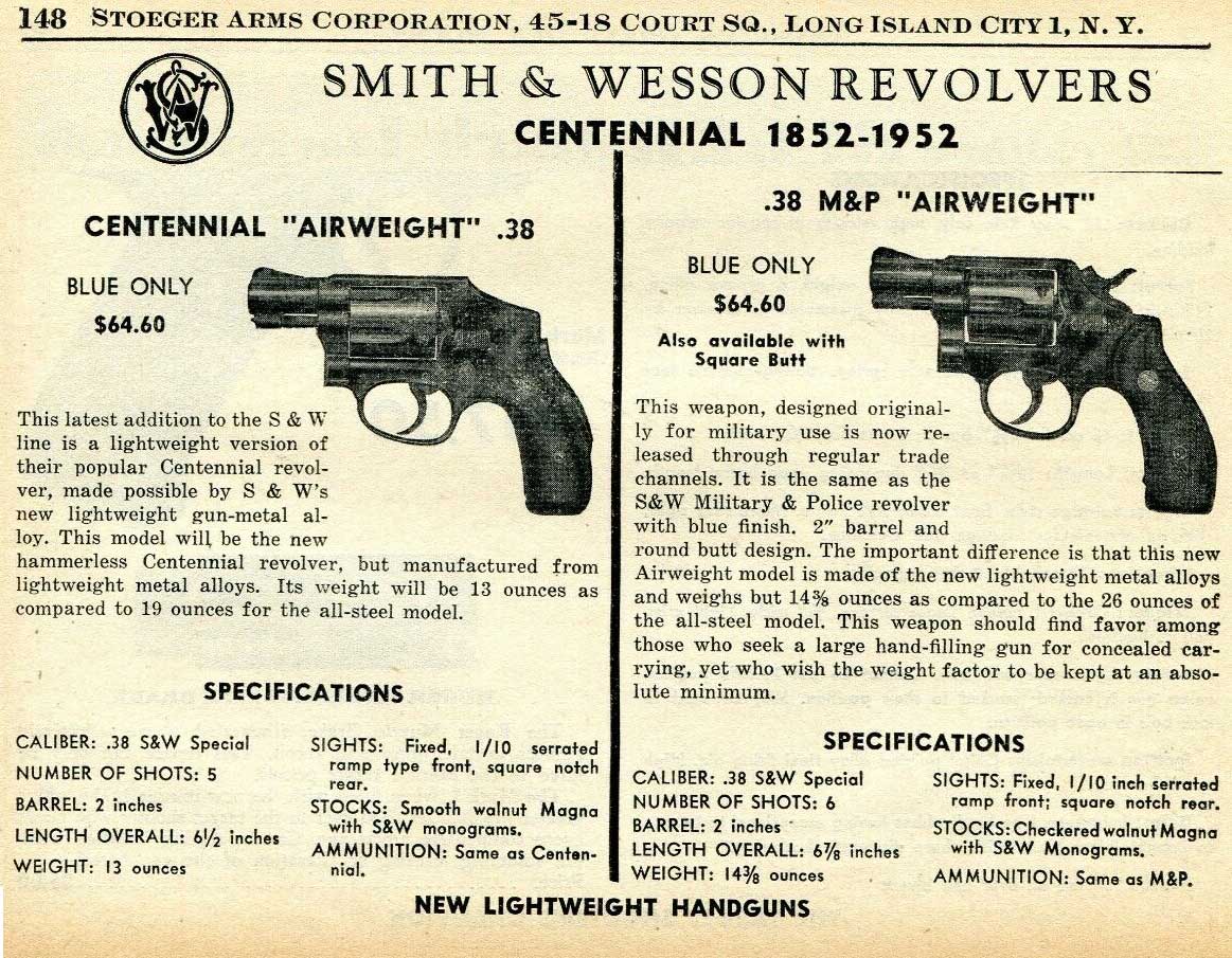 S&W のオールドカタログの一部です。このカタログにはチーフのエアウエイトも載っていますので1951年ころの物ではないかと思います。写真右のミリタリポリス・エアウエイトのハンマー形状はコクサイの初代ミリポリと同じ形です。