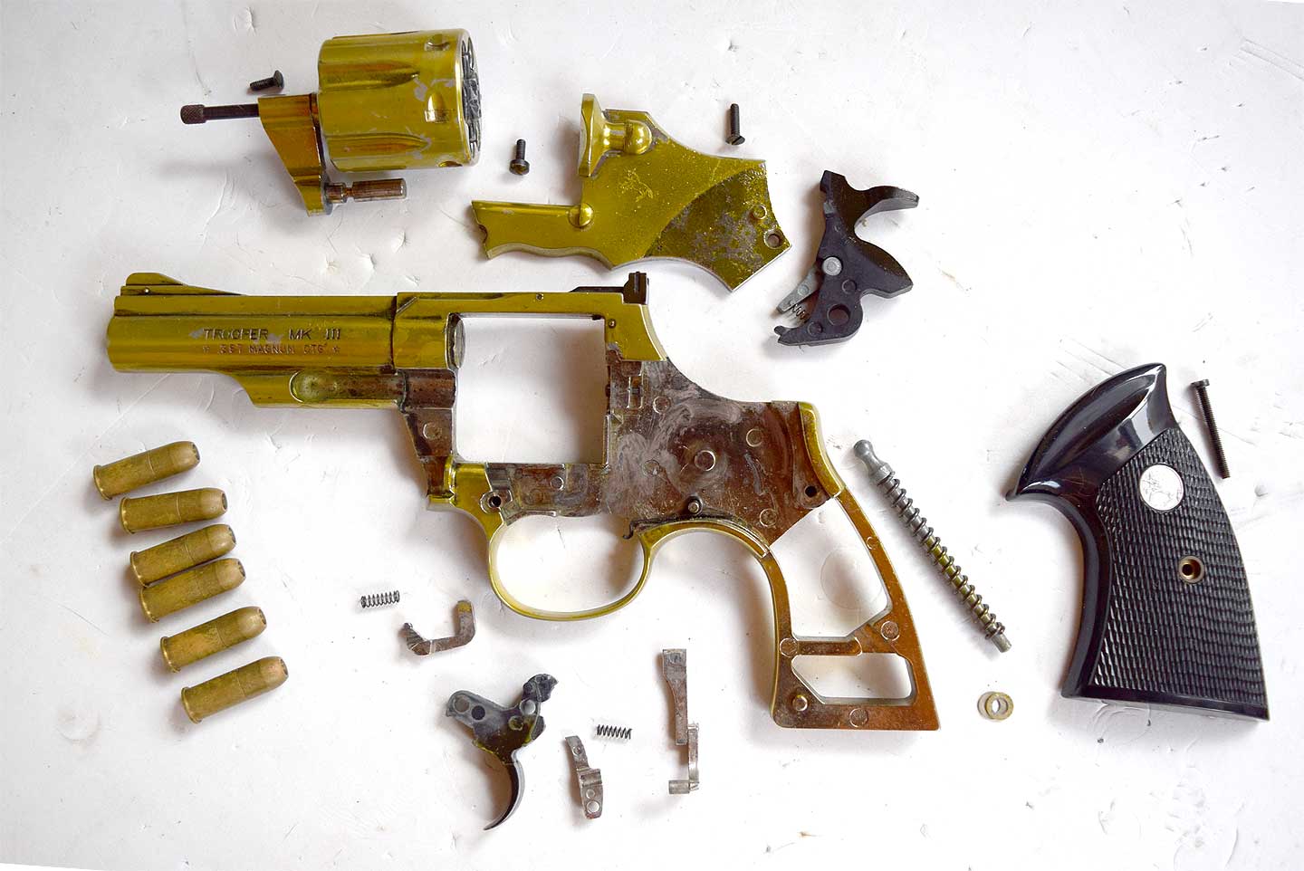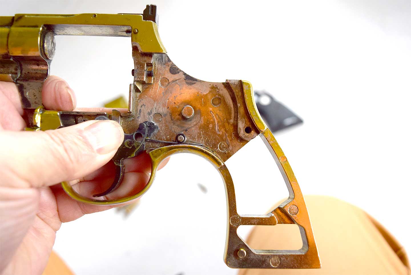 最後に残ったトリガー・スプリングを見て、これはモデルガンでのデフォルメだろうと思っていましたが、実物でも