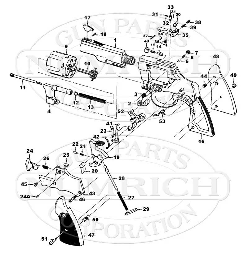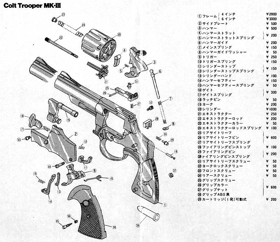 こちらネット上から実物写真を取ってきました。ハンドはSAA 時代からの伝統的な板バネです。右は実物分解図ですが、53番パーツにモデルガン同様なトリガースプリングが見られます。