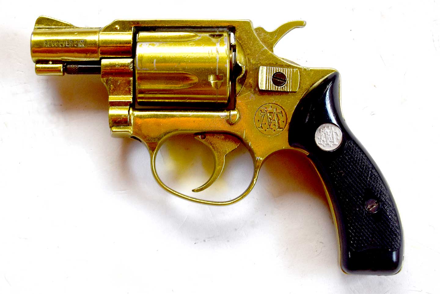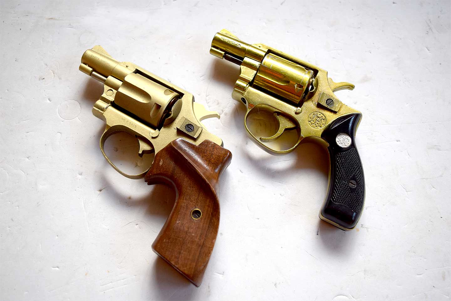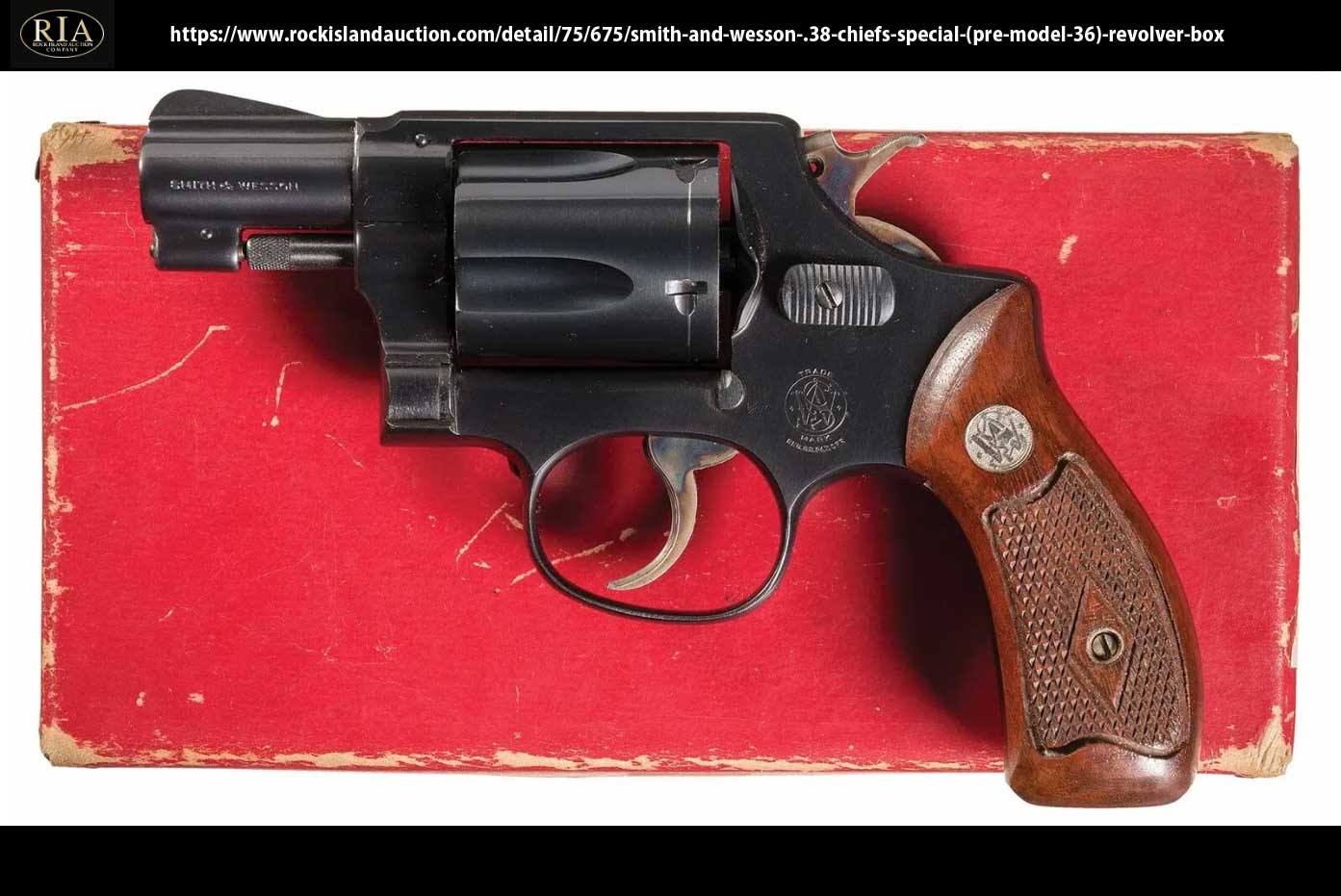非常に程度の良い実銃写真です。1950年製だそうで、まだモデル36と呼ばれる前です。シリンダラッチがオールドタイプの小判型です。トリガーガードがけっこう丸いですね。URL はこちら↓。https://www.rockislandauction.com/detail/75/675/smith-and-wesson-.38-chiefs-special-(pre-model-36)-revolver-box
