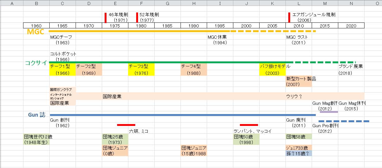 私は常々、モデルガンの賑わいと若者の人口について密接に関係があるのではないかと思っているのですが、この表を見ると 団塊世代が関わっているのは、2度の規制と2000年くらいの高級モデルガン出現だと思います。エアガン規制は 団塊ジュニアなのかジュニアたちの子なのかよく分かりませんが、規制がかかるくらい改造するにはお金も要るので やはり団塊ジュニアたちでしょうね。
