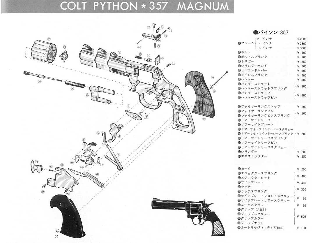 実物のパイソンのボルト機構をモデルガンで変更している優れメカです。S&Wのように前後にボルトを動くようにして います。ボルトに開けられた長円の穴がポイントです。MGCの小林氏の設計力が光ります。