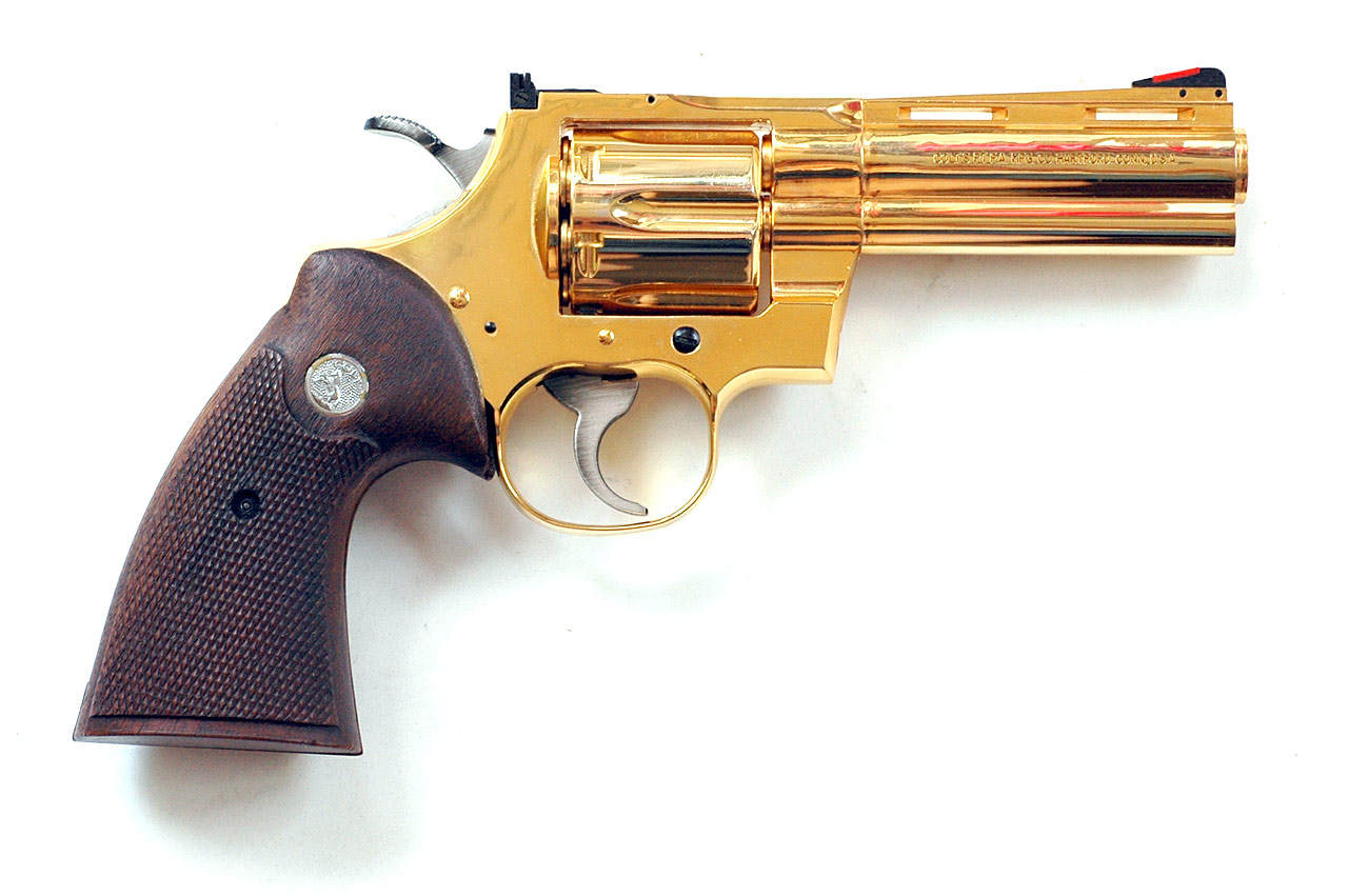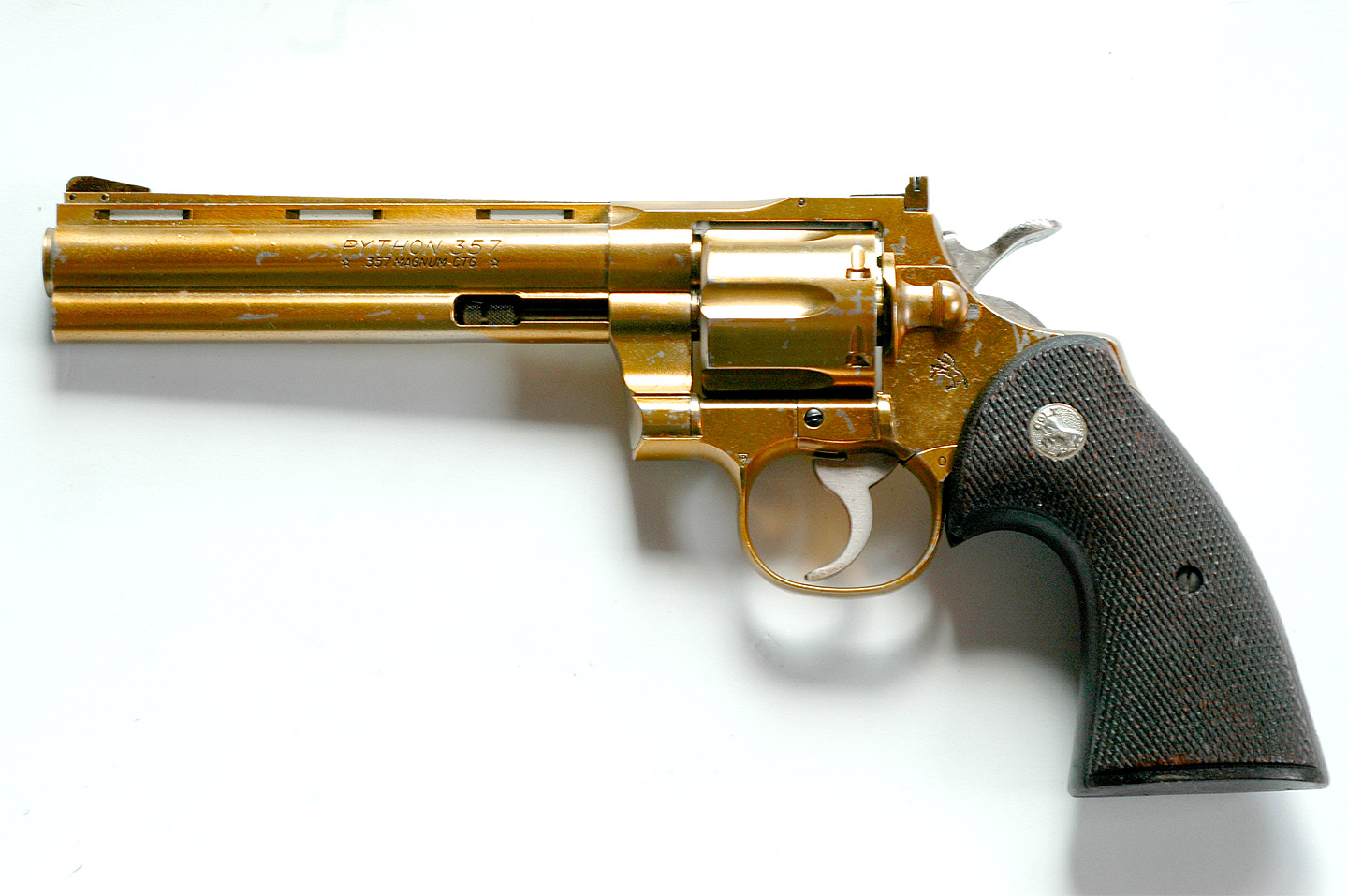 実物グリップを付けたコクサイの2代目パイソンですが、一番上のものが初期型ですぐにメッキがあせてしまう物です。 クリアイエローを塗っています。