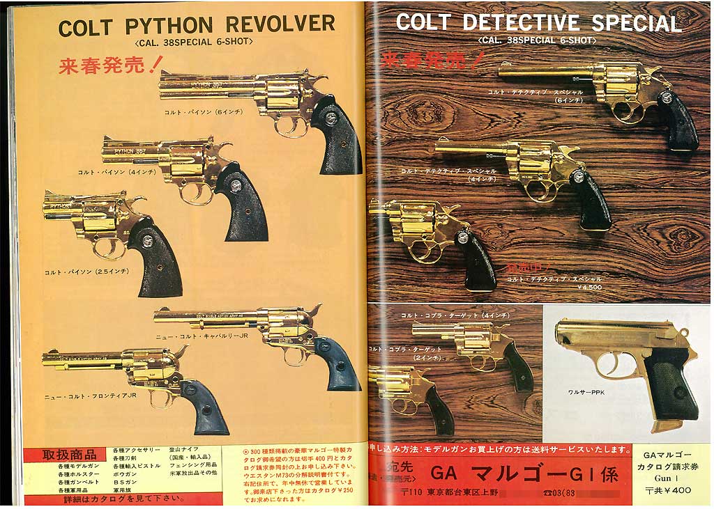 Gun誌 1978年1月号(昭和53年)のマルゴーの広告です。クリック拡大します。この月は銃身分離型モデルガンの販売が12月に規制された ばかりで広告もリボルバーだらけになっています。CMCは写真すら載せていません。 本格的オートが発売禁止になったのでマルゴーもパイソンを発売しリボルバーに生き残りの道を 探ったのかもしれません。 |