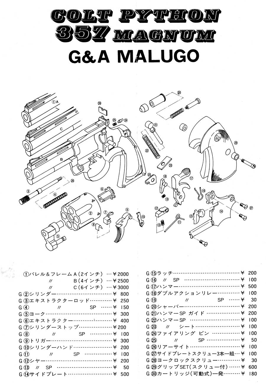 サメのヒレの様なフロントサイト、ラッチの上にあるネジがマルゴーの特徴です。 マルゴーがダイアモンドバックではなく、パイソンと高らかに謳っているのにはちゃんと訳があります。 下の分解図を見ると判るように、ファイアリングピンがハンマーに付いたダイアモンドバック型ではなく、 ちゃんとフレームに付いています。ハンマー打撃面は平らです。その改造のためにサイドプレートにネジが追加されたのかもしれません。 コクサイのダイアモンドバックは、サイドプレートが浮きぎみになるのでハンドの遊びが多くなり、 まともにシリンダーを回せません。マルゴーは動作については改善されています。 |