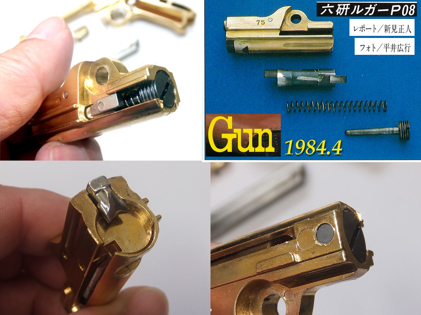 たしかに六研さんは、実物構造と違う形に作っていてマルシンさんも同じように作られています。 ネジを切った方が加工も簡単ですね。新見さんがおっしゃるように、六研の真鍮ルガーを原型としてマルシンルガーが 出来上がったのかもしれませんね。