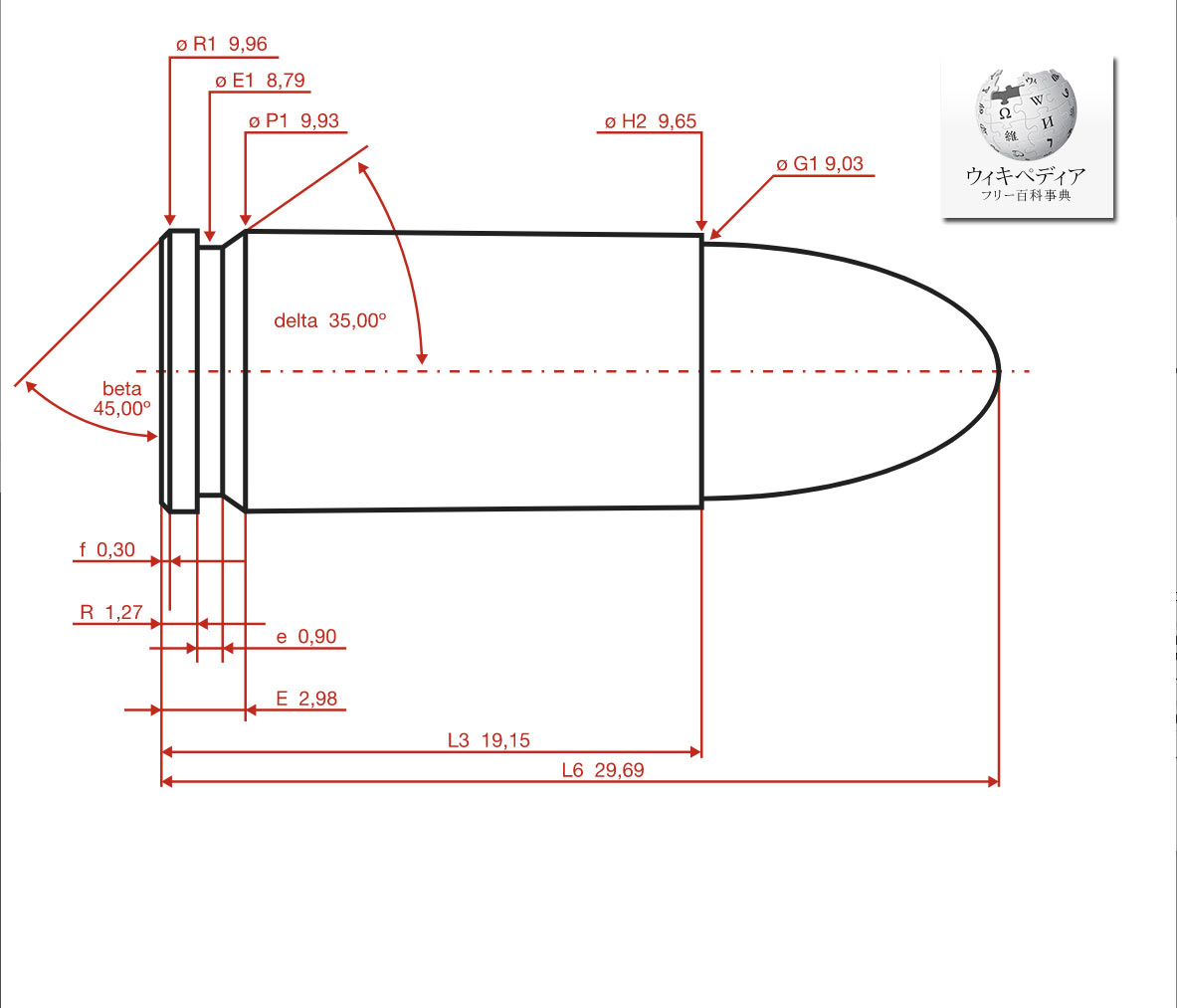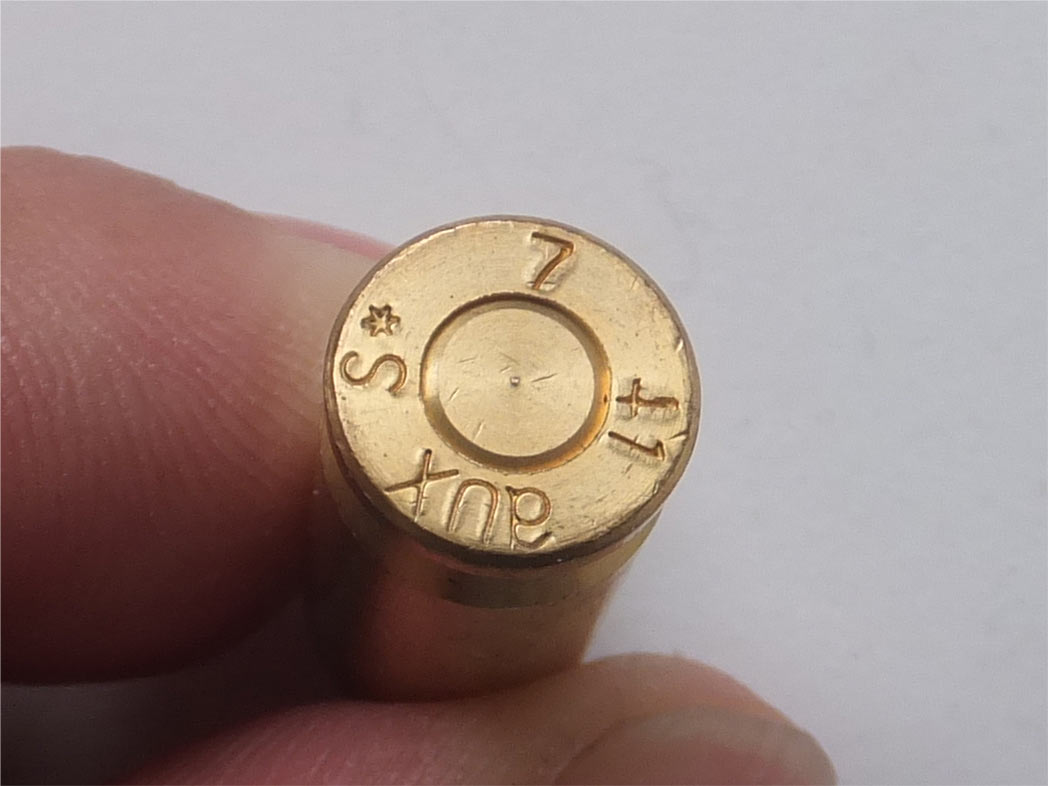 何だか、いかにもヨーロッパぽいですね。45コルトや45ACP のアメリカ弾はまっすぐなケースです。