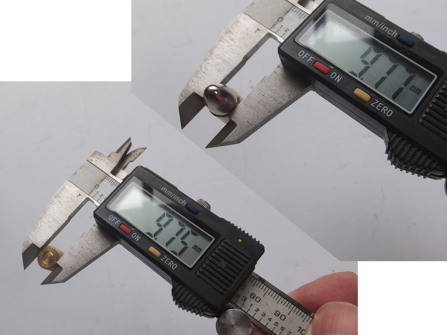 マルシンのP-08 が非常に良くできているのは、採寸するとすぐに判ります。亜鉛鋳造なのに正確に出来ています。 左は図面から言うと32.0mm、右は29.6mmが実銃サイズです。よく再現されています。