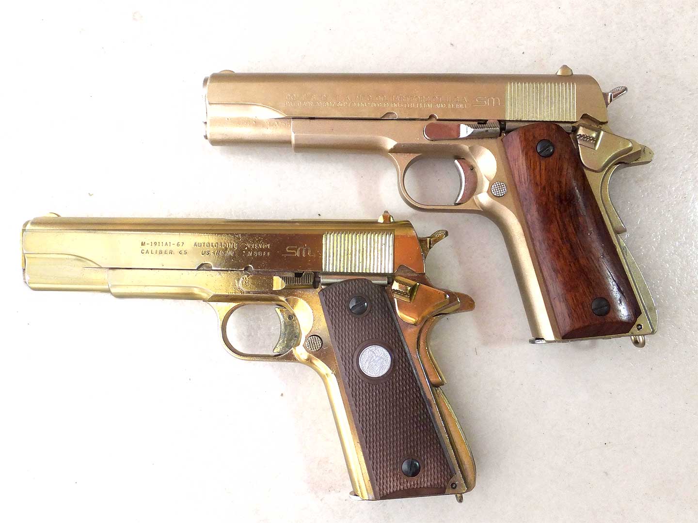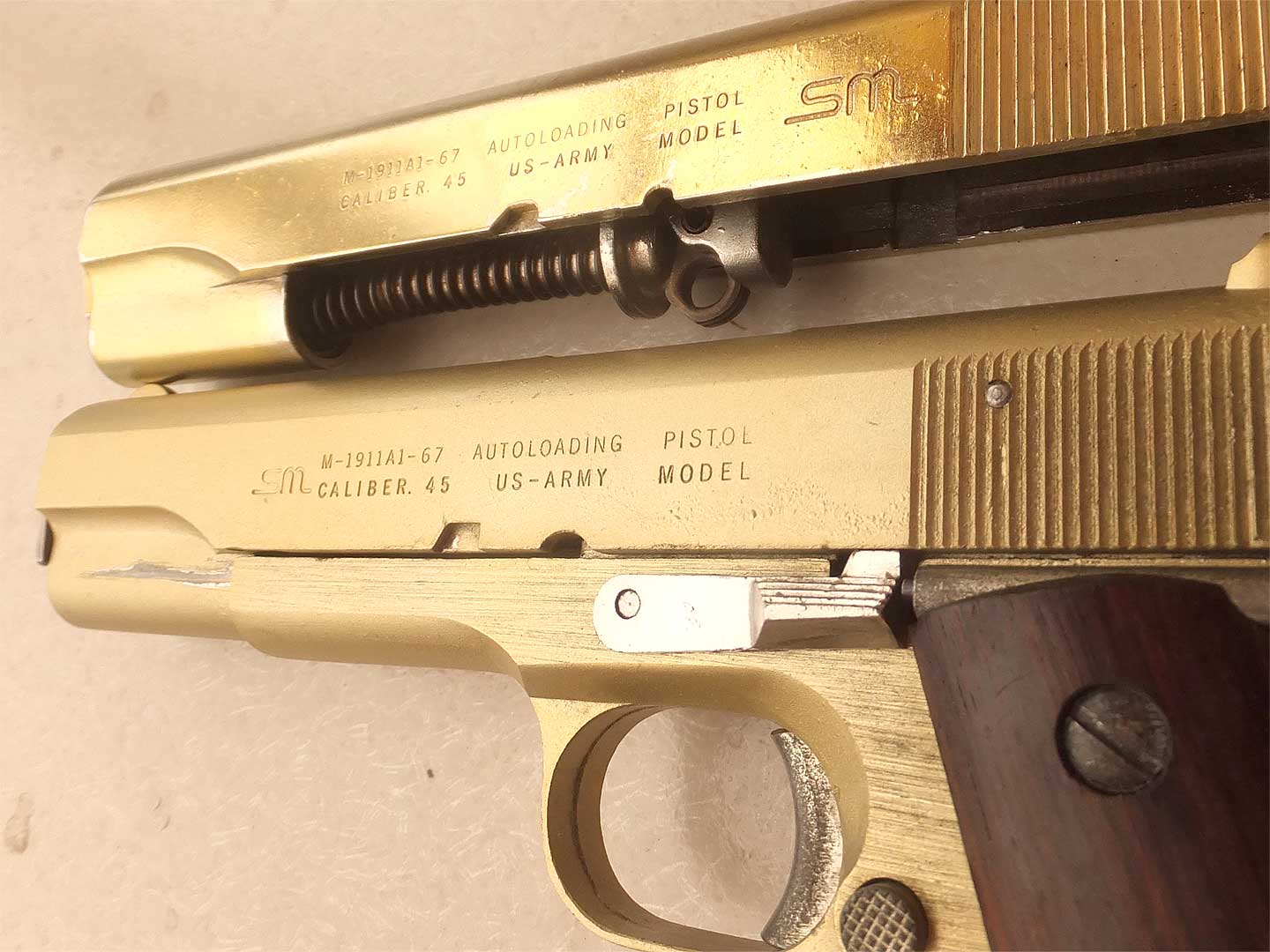 右がプラ製のGM-2 ですが、バレル関係以外はご覧のように全く同じ形です。モデルガンのガバの スライドストップは折れる危険があり脆弱な部分ですが、GM-2 では極太の物に設計され、フレームにも、 はまり込むほど板圧も厚くされています。GM-3 のフレームも全く同じ形に出来ています。