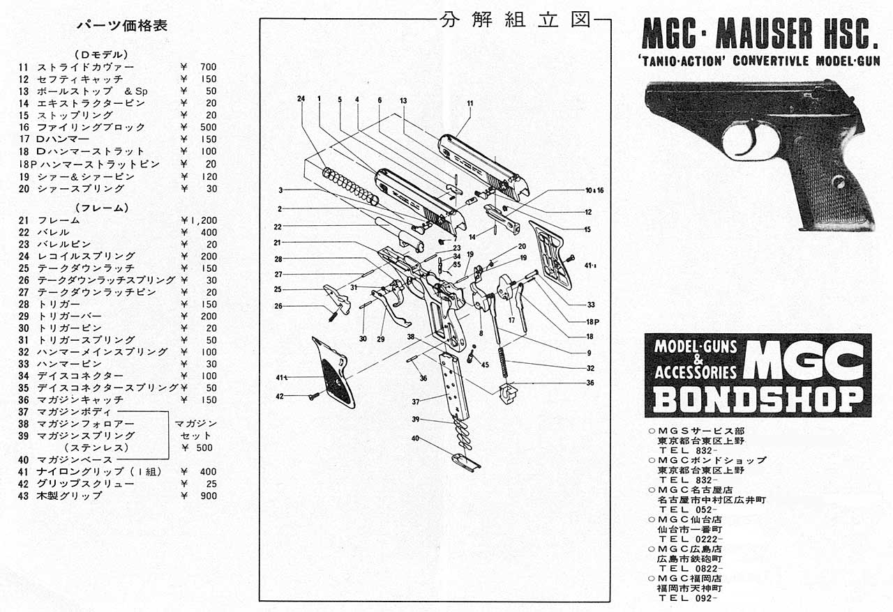 HSc のチラシです。裏側には、「スライドと数点のパーツ変更でスライド・アクションも楽しめます」と書いています。 むかしは、タニオアクションとは言っていなかったようです。