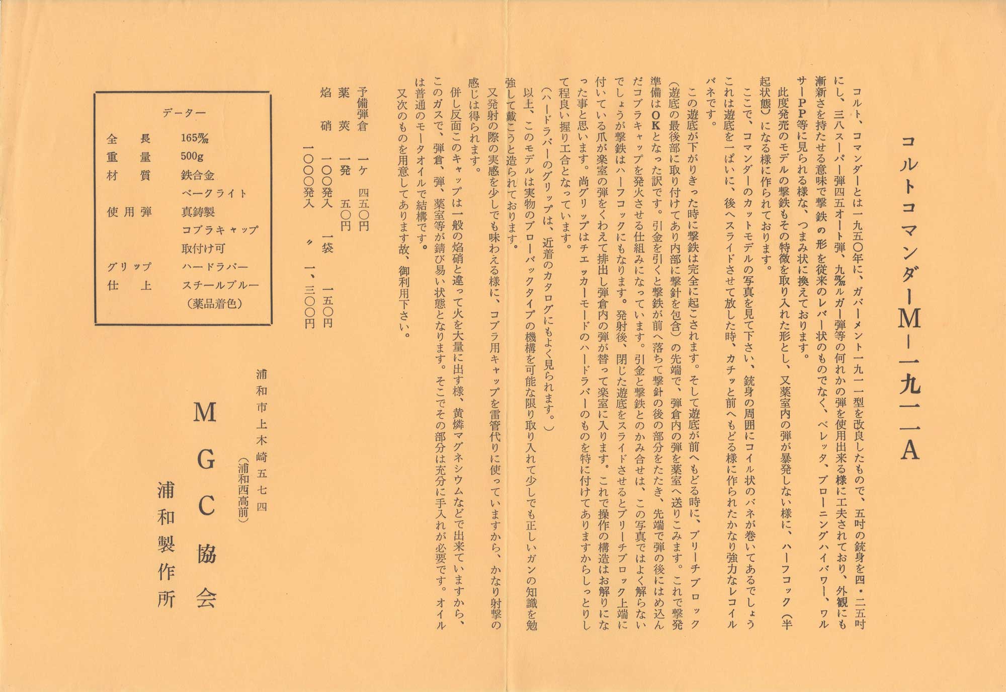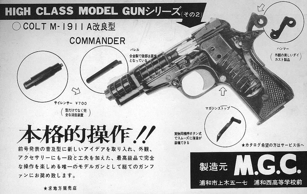 MGCコマンダーは、発売後数ヶ月で警察の指導により発売禁止にされたようです。 考えられるのは、後撃針のシステムでしかも輸入品のコブラキャップは、 かなり強力だったらしいのでその辺も影響したのかもしれません。