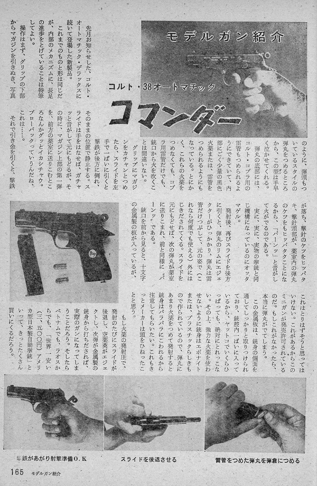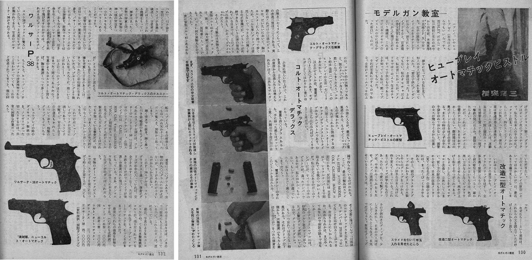 ヒューブレーと日本製デッドコピーのヒューブレーのこととMGCコルトスペシャル、P−38の 事が書かれています。すでにモデルガンという言葉が自然に使われています。