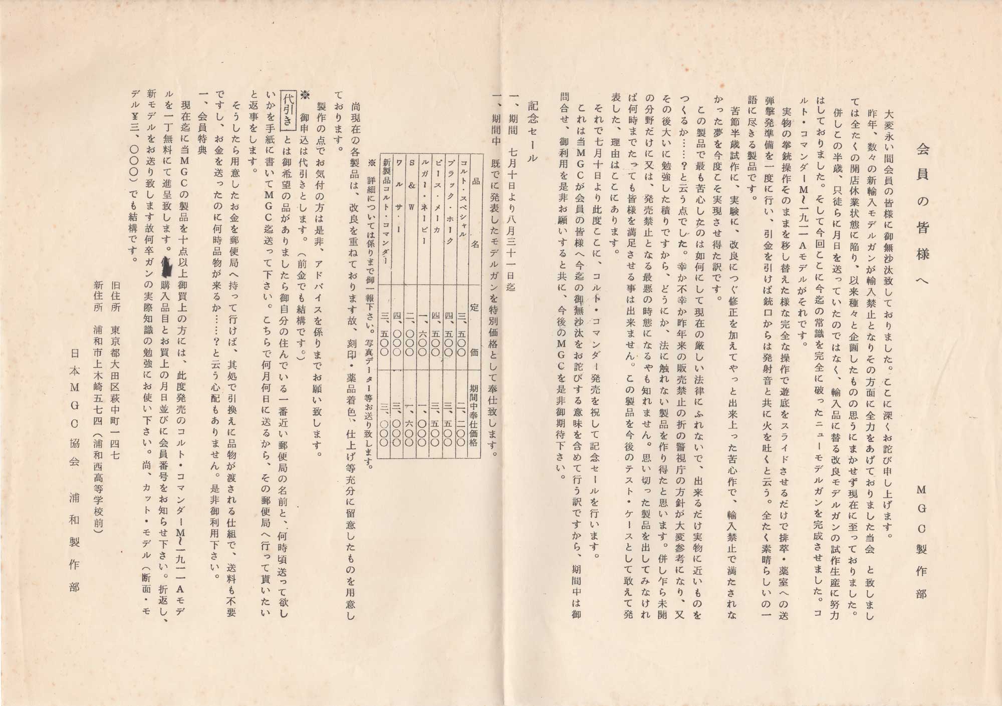 匿名様からは、使わせていただいた他にも多くの写真を頂きました。貴重な物を有難うございました。 おかげさまで、ほぼ幻ともいえるコマンダー、ベレッタについて記録を残すことが出来ました。 重ねて御礼を申し上げます。1960年頃20代半ばだった小林青年は、夜中までヒューブレーにヤスリを当ててゴシゴシと削っていたに違いありません。 それから半世紀たった今でもこのモデルガン界の苦境の中、精一杯に新製品であるGM−7や新型カートリッジを 発明し続けています。すごいエネルギーですね。