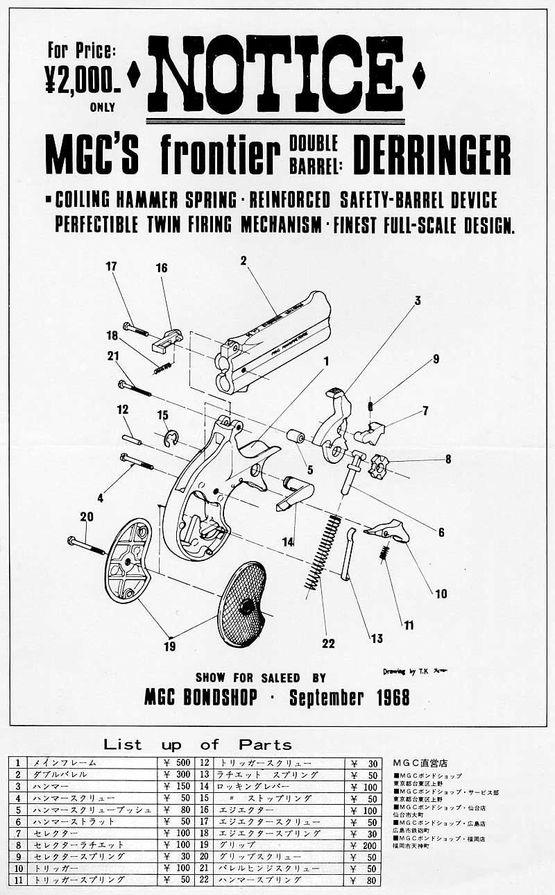 ![]() こちらの実銃の分解図を見ると解るようにファイアリングピンのテンションのかけ方も MGC は再現しています。 CリングのおかげでリアルっぽくないMGC デリンジャーですが、どうして、中身は 最も実物を再現しているモデルガンです。