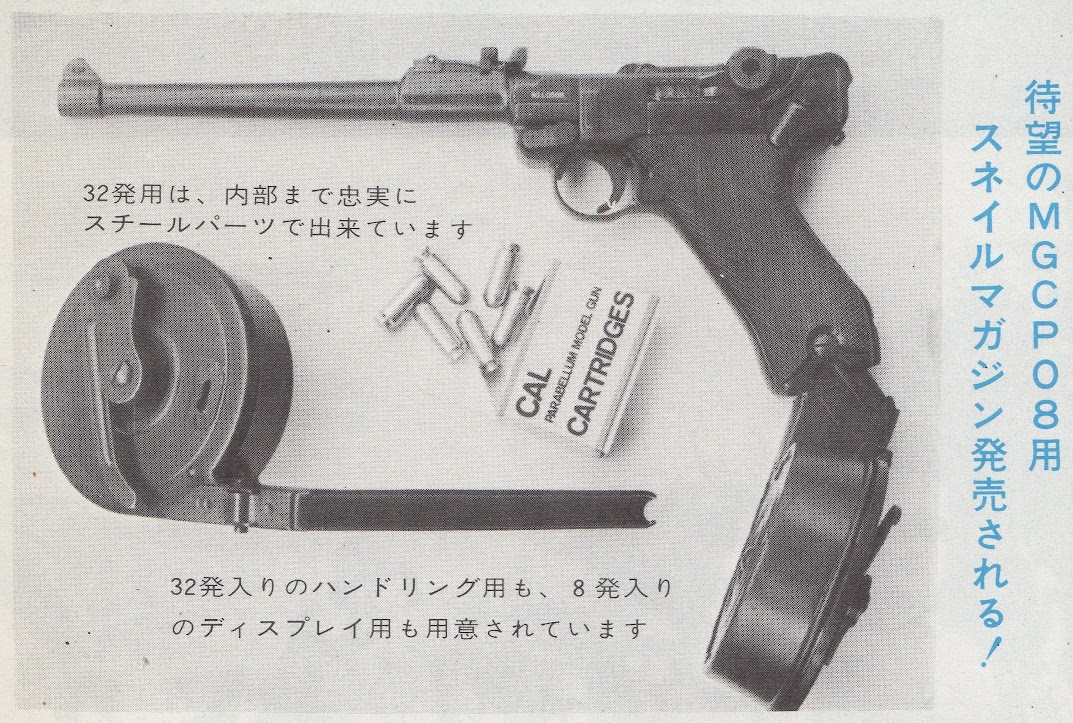 スネイルマガジンです。MGC の物は初期には実物と同じ32連発でしたが危険だという事で 容量が減らされたらしいです。バネがきつくてカート装填時に指を切ったそうです。