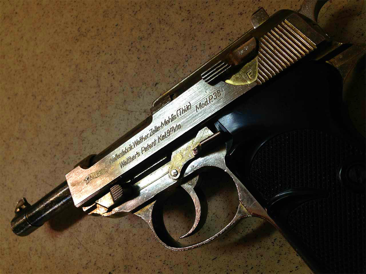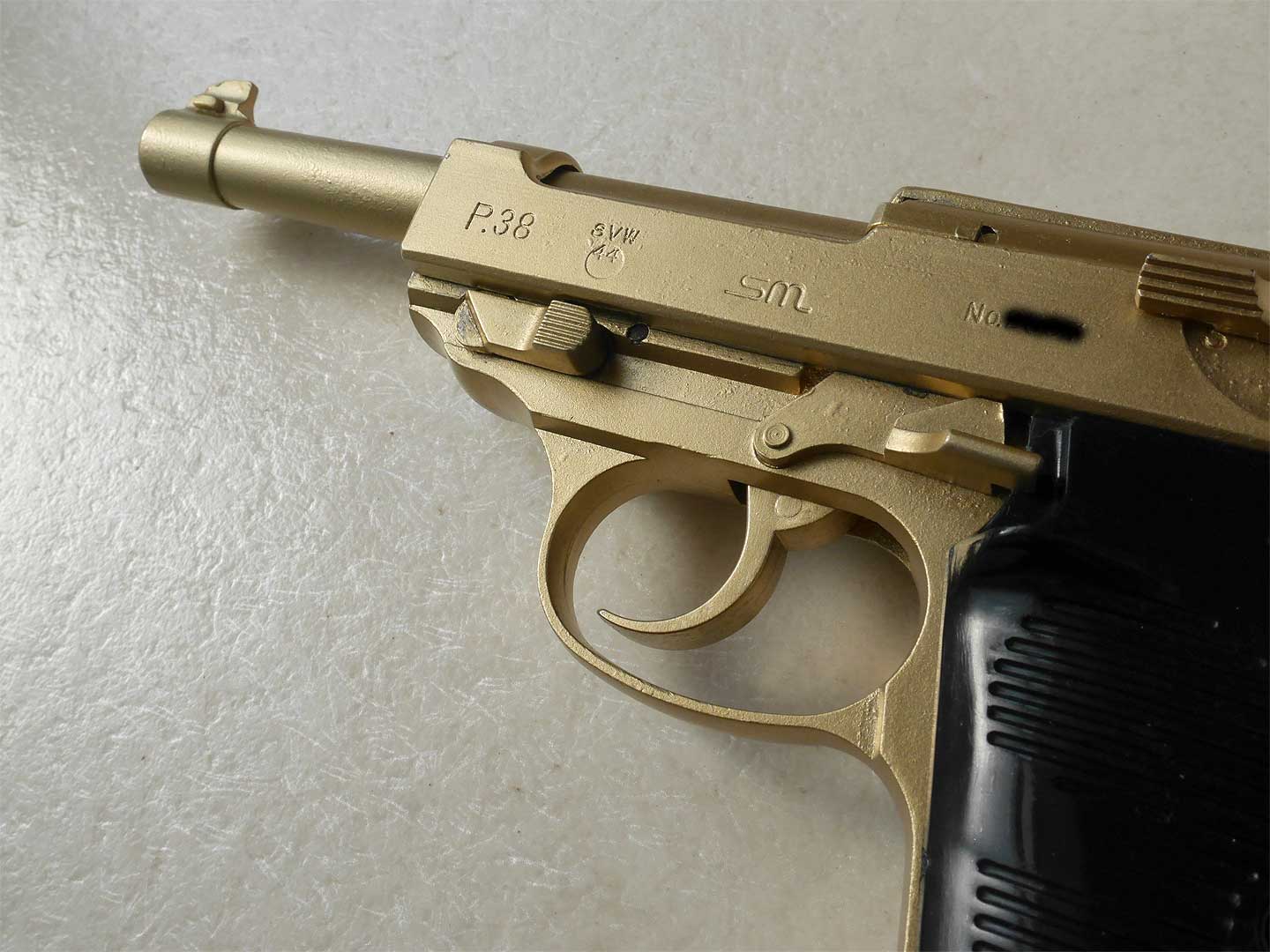 ちょっと脱線しますが、写真のようにCMCのp38は、46年規制の直前に発売されたため、黒いガス抜けタイプがありました。すぐに規制が来ましたので 少数しか売られていません。私も知りませんでしたが、写真を拝見させていただいたことがあります。紙箱の内側は発泡ではなく赤の布張りがなされていました。