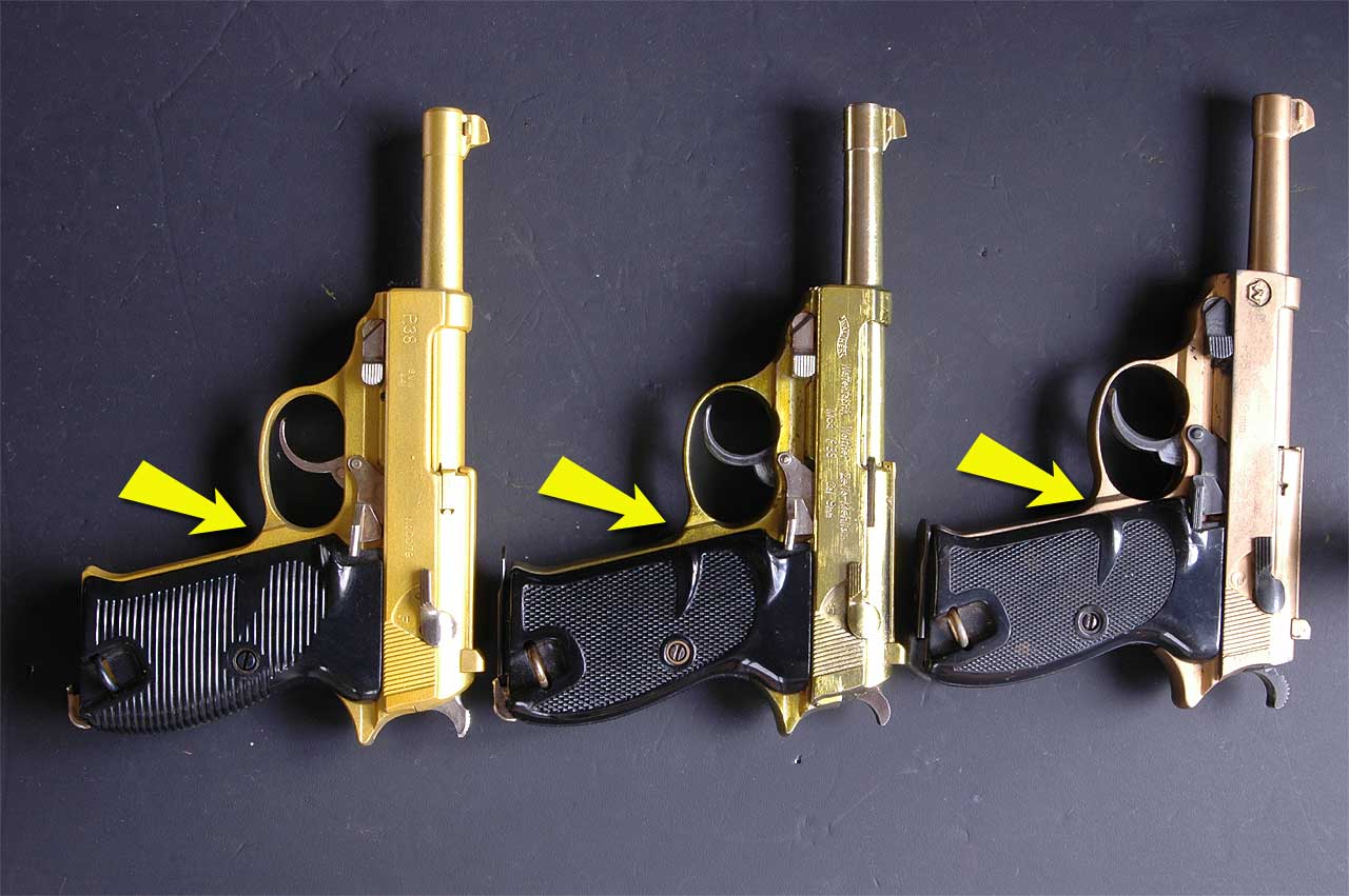 裏付けとして、CMCの原型写真に使用されているグリップはスプリーベルク社製の実物グリップと思われます。一般的な AEG社製より溝が1本 少ない事で判ります。それがぴったりと嵌まっていると、いうことはフレーム内側の処理も実銃と同じ加工がなされていると言うことです。 ところが、製品版のCMC・P38では、実物グリップも嵌まらないし実物マガジンも入れられません。ということは、フレームの肉抜きが小さくなった = フレームが太くなった。ということで強度を増したと思われます。それに伴いトリガーガード付け根を補強した結果ではないだろうか、とのご指摘を頂きました。