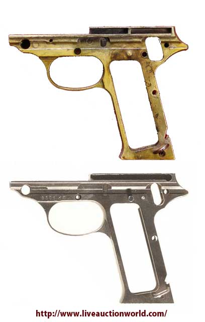 うむっ、鋭い指摘ですね、あそこの形状は中田の頃から見られますので中田モデルを開発中の作動テストの際にトリガーガード付け根が 折れてそこを補強した形に変更されたのかもしれませんね。だからのちのCMC、MJQも補強タイプに作った・・納得いく論理展開です。 貴重な、ご意見有難うございます。右の写真はクリック拡大します。MJQと実物フレーム写真を並べています。