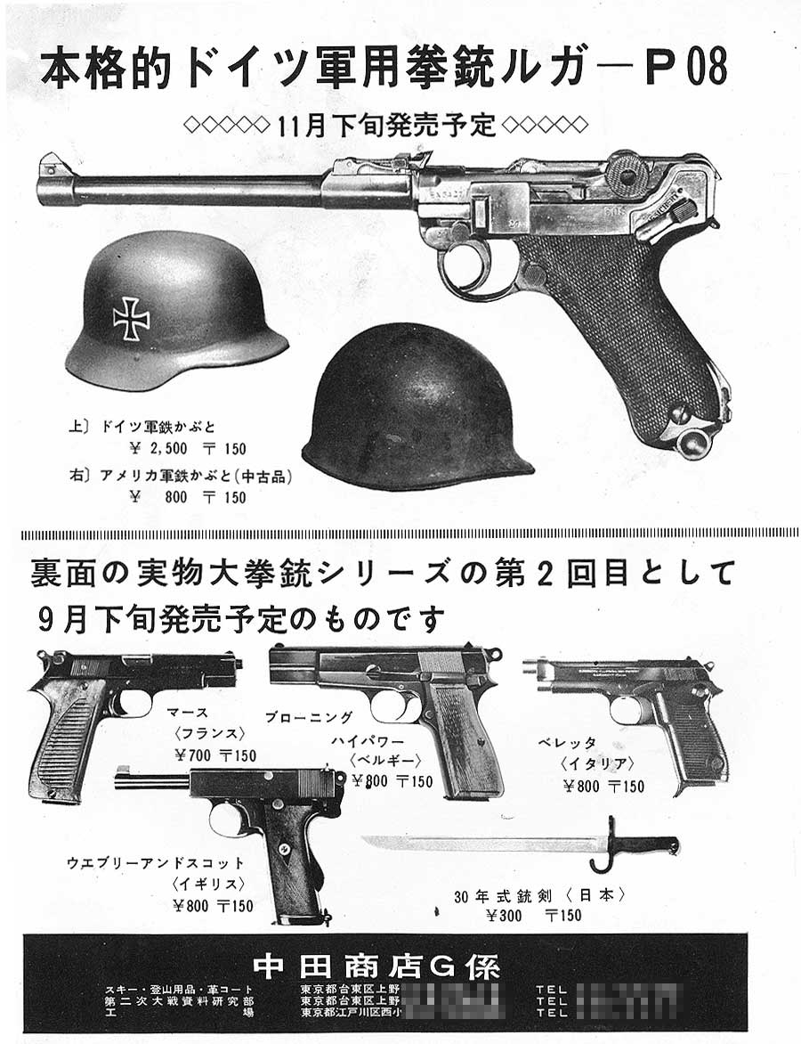 文鎮カラーの裏には、CMCから発売予定のガバメントと中田から発売予定のルガーの 広告が載っています。ともに開発におくれが見られ、写真はどちらも実銃の物が使われているようです。