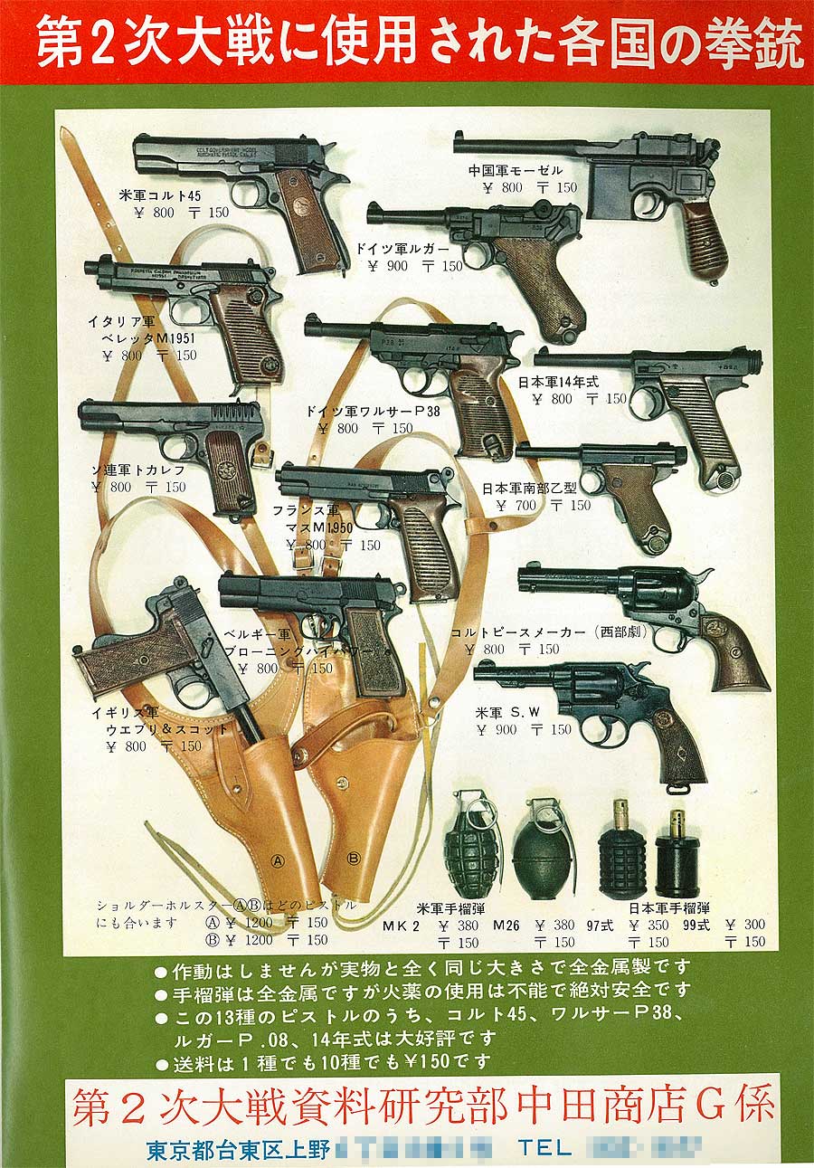 ガバメントは、A1と1911の混同型。SAA、S&W1917、ウエブリースコット、南部式大型拳銃、同小型拳銃 は実際に見たことがある。広告に出ていない南部大型拳銃も存在したので、他にも 未知のモデルが有ったのかもしれない。