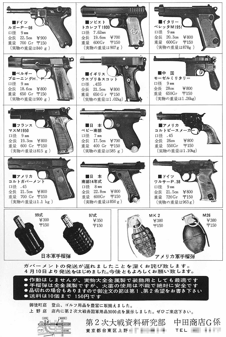 中田商店は、とりあえず急場を凌ぐために六人部氏が戦争博物館展示用に作っておいたプラ製のモデルを 型取って文鎮モデルを製作販売しました。亜鉛合金製だったと聞いたことがあります。 販売種類などよく判らないことが多いのでGun 誌の広告をまとめてみることにしました。 資料としてご覧下さい。カーソルが指になる写真は拡大できます。