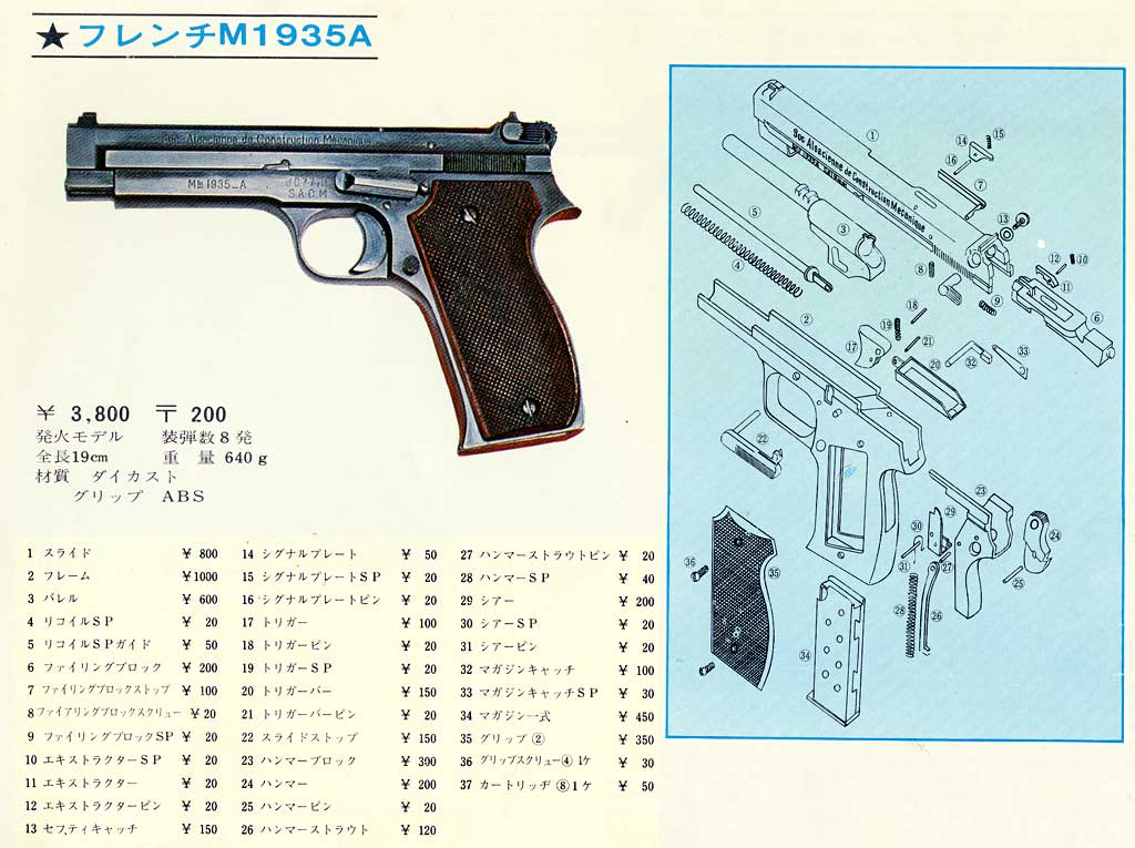 日本では、フレンチと呼んでいますがインターネットの世界で検索しても出てきません。 インターネットで探す時には「mle 1935a 」と入力するのが いいと思います。フランス語なら「pistolet 1935A 」ですね。フランスの銃だからフランス語で検索した方が良いと思い、 結果良いページに行き当たりましたが、日本の拳銃を日本語で検索してもトイガンばかりなので悲しくなります。