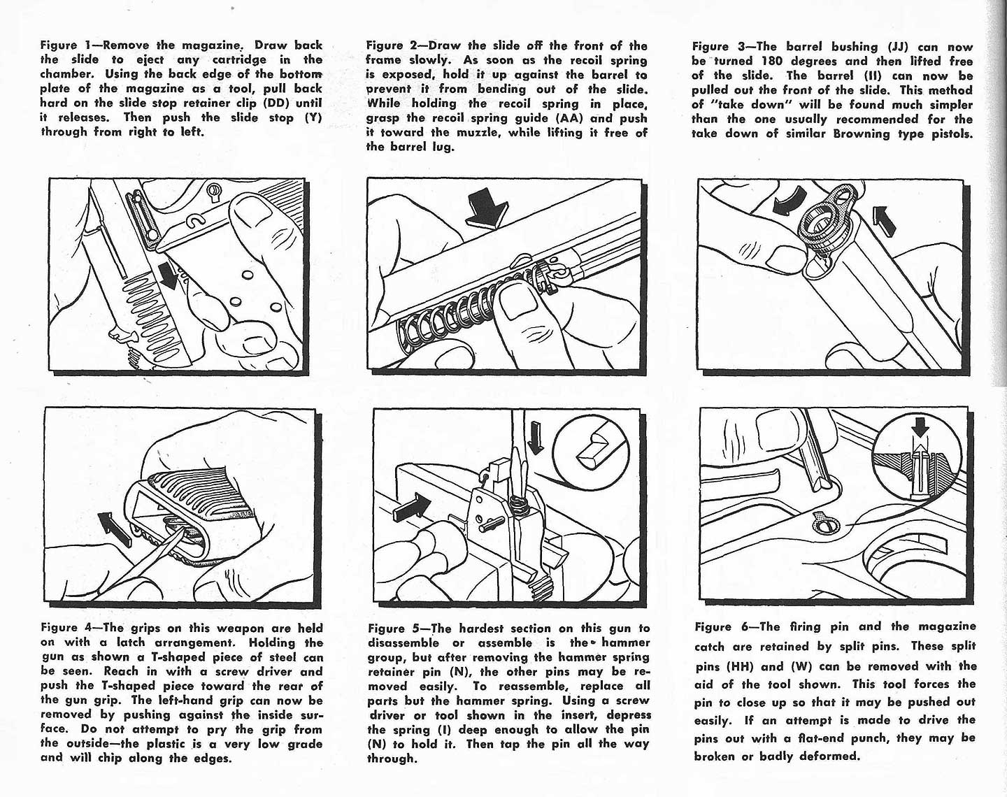 まぁ分解できるのならばどういう順番でも良いのですが、左の図は中田のカタログからですが、ガバメントの分解のように トップリングからバラします。右の図は、NRA の分解図集からですが、スライドストップを抜いたら、そのままスライドをバラしています。youtube などを見ても皆さんこの方法でバラしていますね。その方がやりやすく正解でしょう。