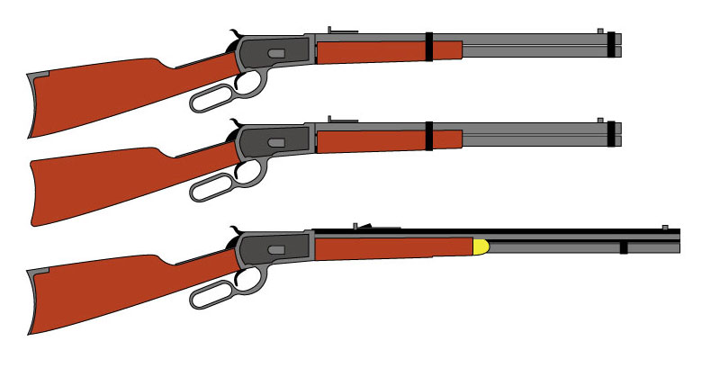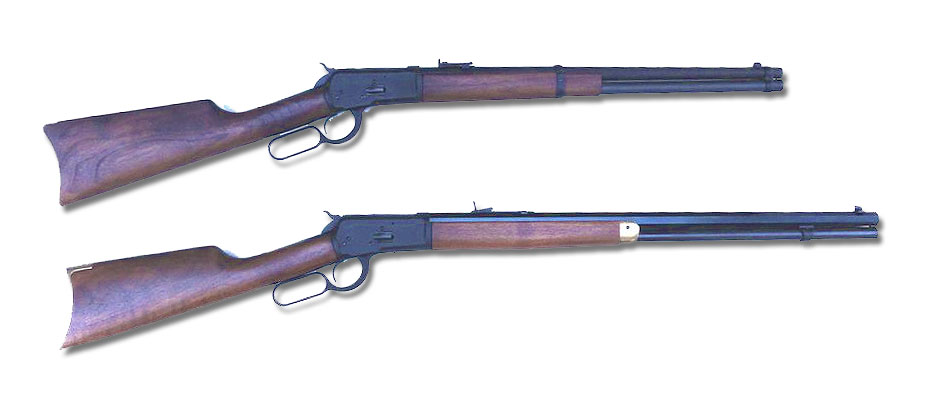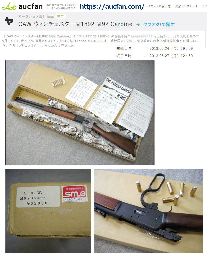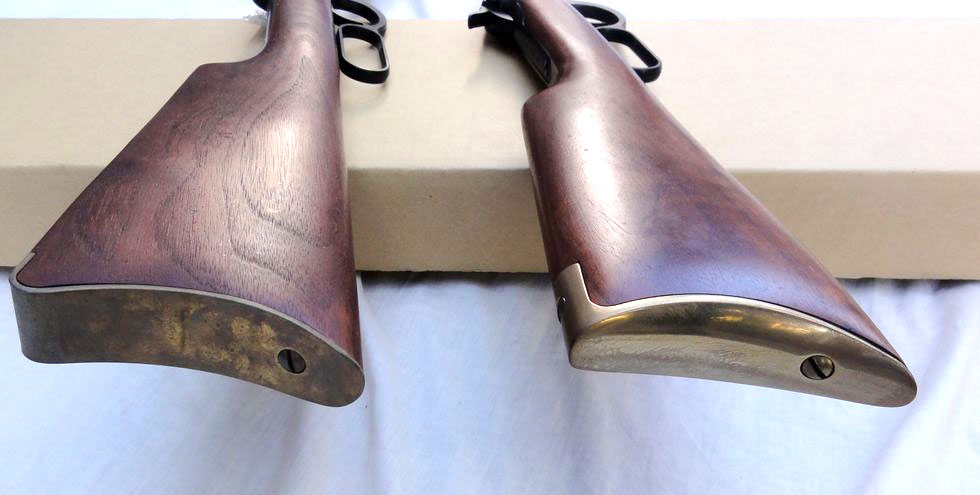 これを見ると、かつてのCMC のモデル92が三日月形のクレッセント(crescent)・バットプレートのみだったのですが、CAW では カービンモデルに滑らかなバット・プレートも用意したようです。バレルの長さからいうとモデルガンは、カービン銃なのでライフルによく使われる クレッセント・バットプレートでは、CAW の社長にとって違和感があったのかもしれません。