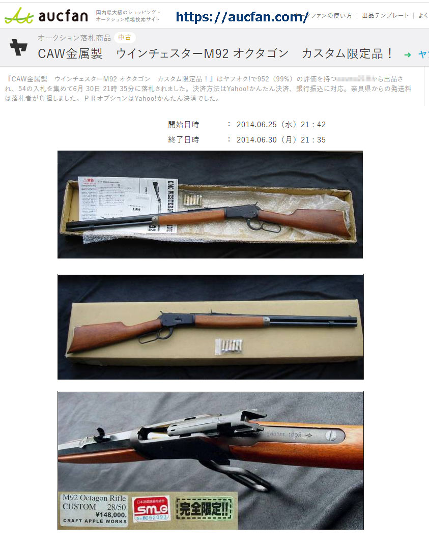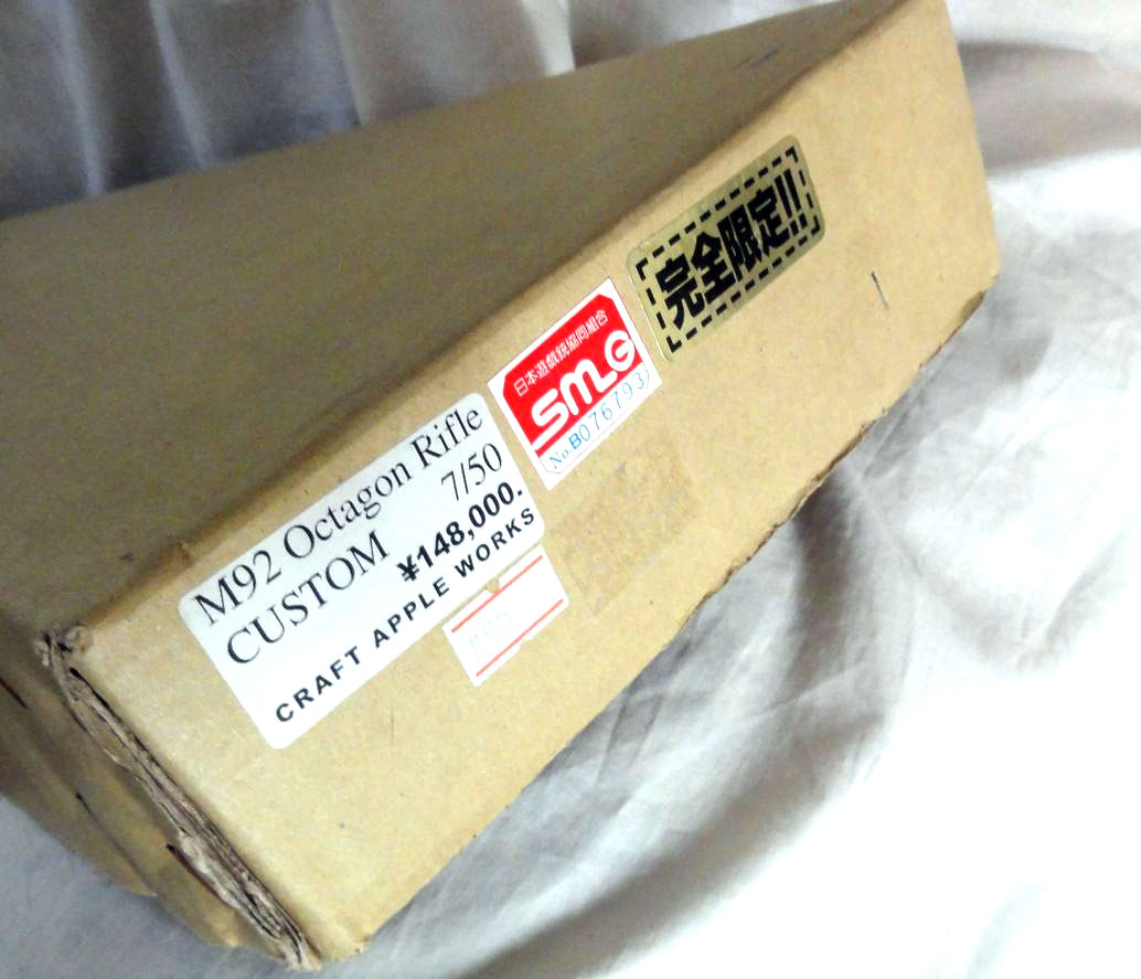 オクタゴンライフル 148,000円 とあります。ネットでの情報では、50丁限定品でバレルはアルミ削り出し、 リアサイトは実物を使用しているとのことです。この写真の物は、50分の28番のようです。