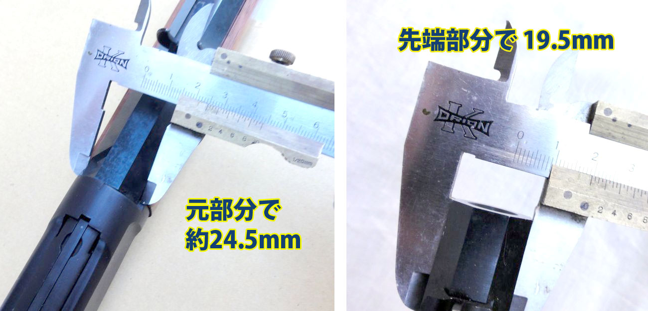 オクタゴン・バレルは、機関部の方が太くて銃口の先端部に向けてどんどん細くなっています。