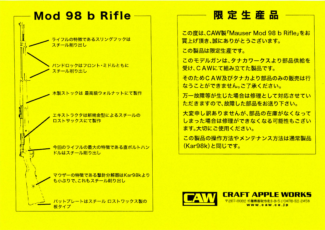 こちらのページの中の「てっぽうのページ」→「ドイツ」→「CAW 98b 」の紹介ページは、手厳しく書いておられますが、大変参考になりました。