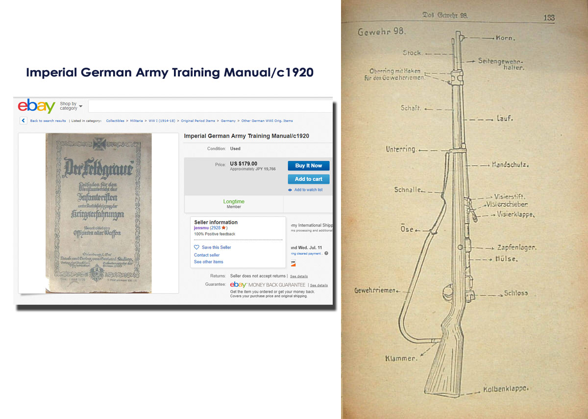 ます。弾薬やスリング、銃剣など非常にマニアックです。写真のようにドイツ語バージョンと英語バージョンがありますので購入時はお気を付けください。Amazon で買うと4万くらいしますが