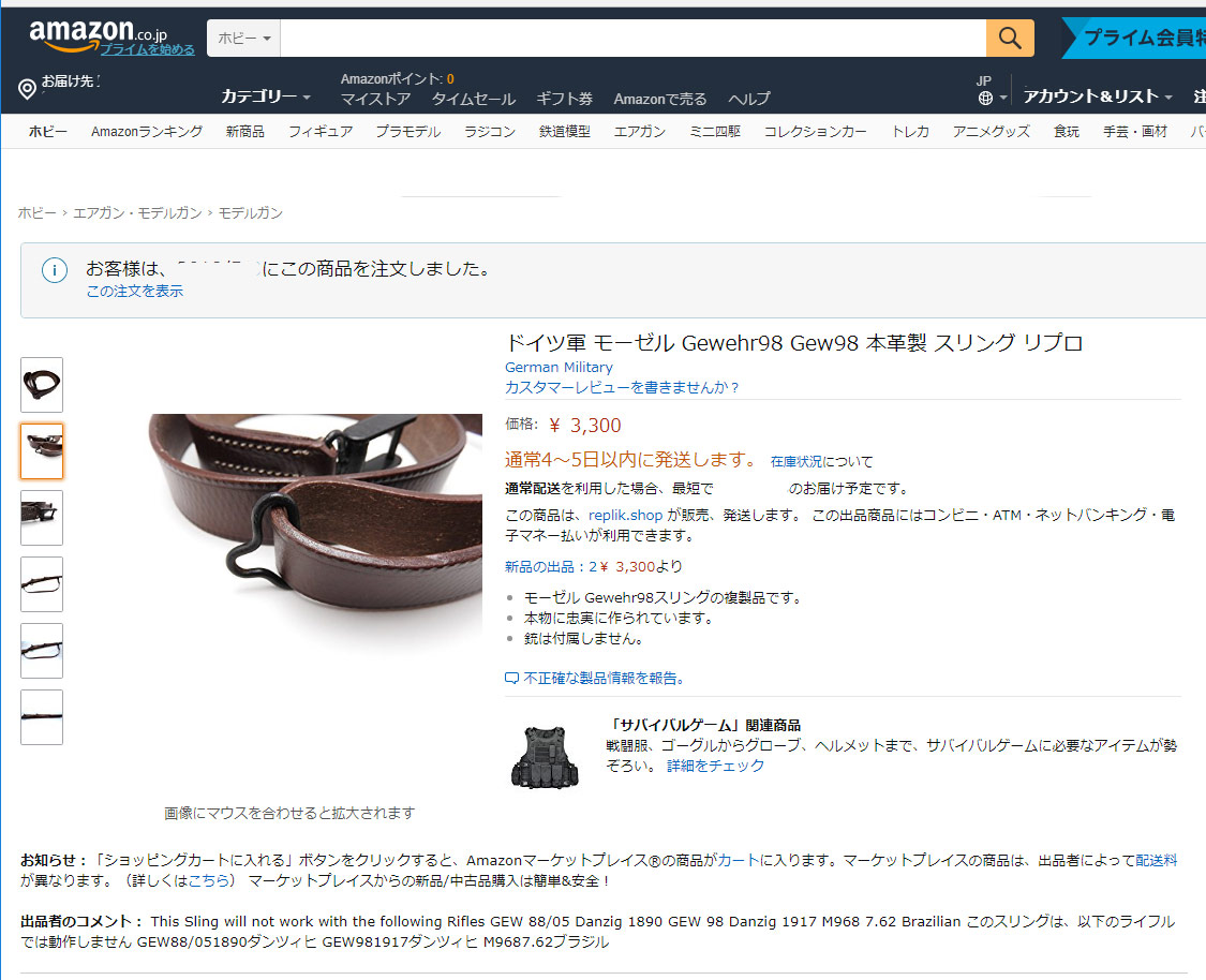 スリングは、Gew98 用がアマゾンjpで売っていましたので購入しました。発送連絡から数週間しても到着しないので問い合わせをしたら別の品を1週間で送ってきました。インドの会社のようです。 誠意を感じました。 つくりは、それなりにチープですが、ワンタッチ金具やフック取付部など Gew98 スリングをきちんと再現しています。