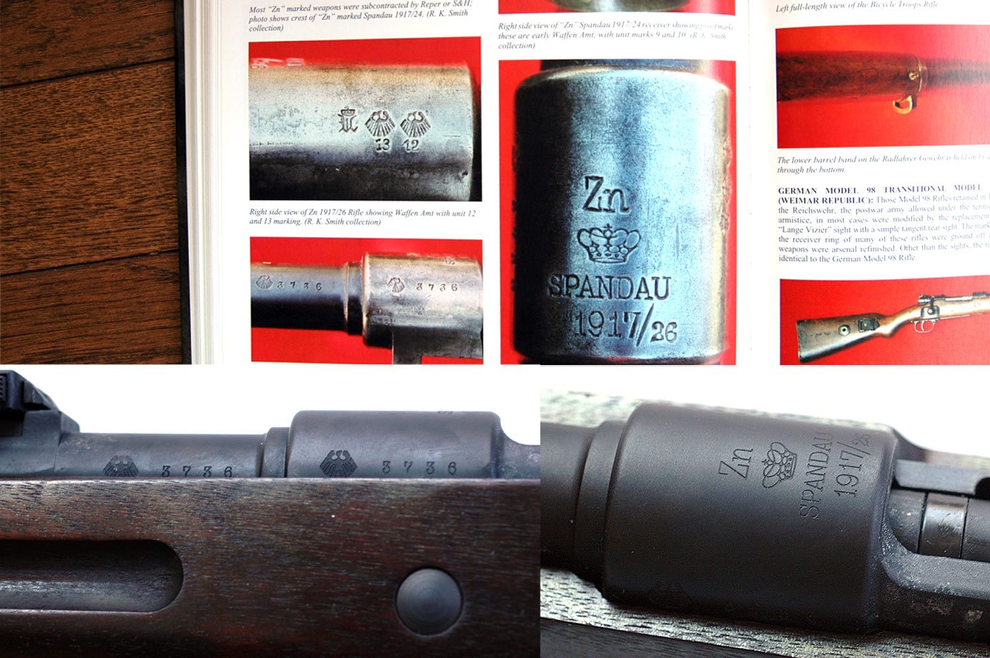 書籍にある刻印とシリアルナンバーをそのまま再現しています。Zn は、ツァイエーン軍需工場(Zeithain Munitions Establishment) で組みなおされたGew98 のマークです。また、元々がスパンダウ工廠で1917年に組み立てられていたものをリビルドして 1926年に生まれ変わらせた刻印だそうです。こちらに別シリアルの同じ銃が載っています。その説明書きに書いてありました。 (すでに閉鎖)