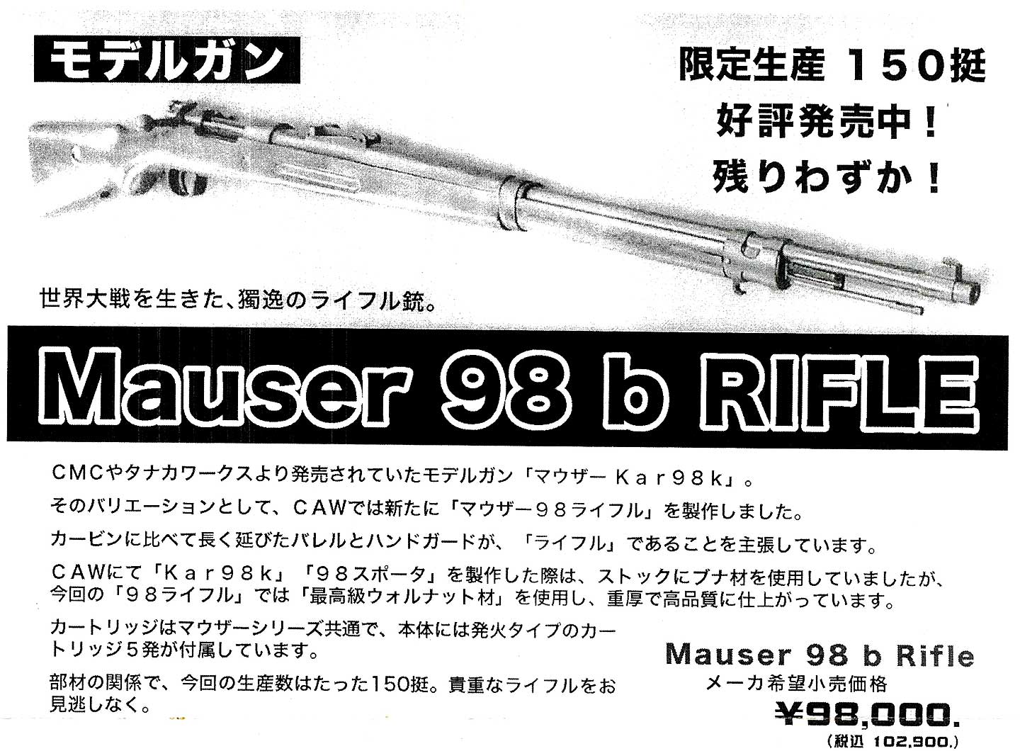 CAW のモデルガンは、もともとGew98 として作られたのですが、リアバンドだけが左通しな為にKar98b でもなく架空の98bという製品名で 販売されてしまいました。当ページ後半では、Gew98 のリアバンドを入手して、本来のCAW製 Gew 98 として生まれ変わってもらいました。