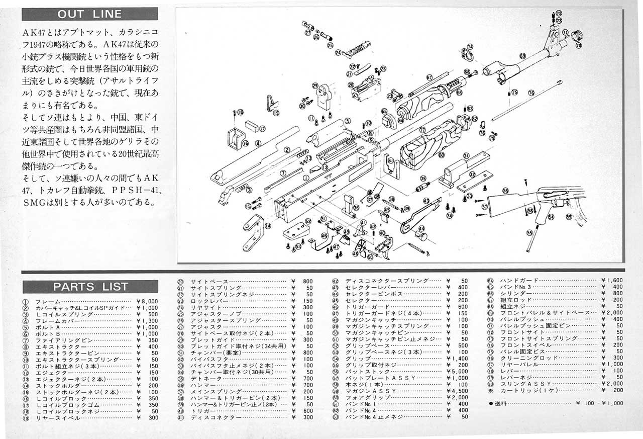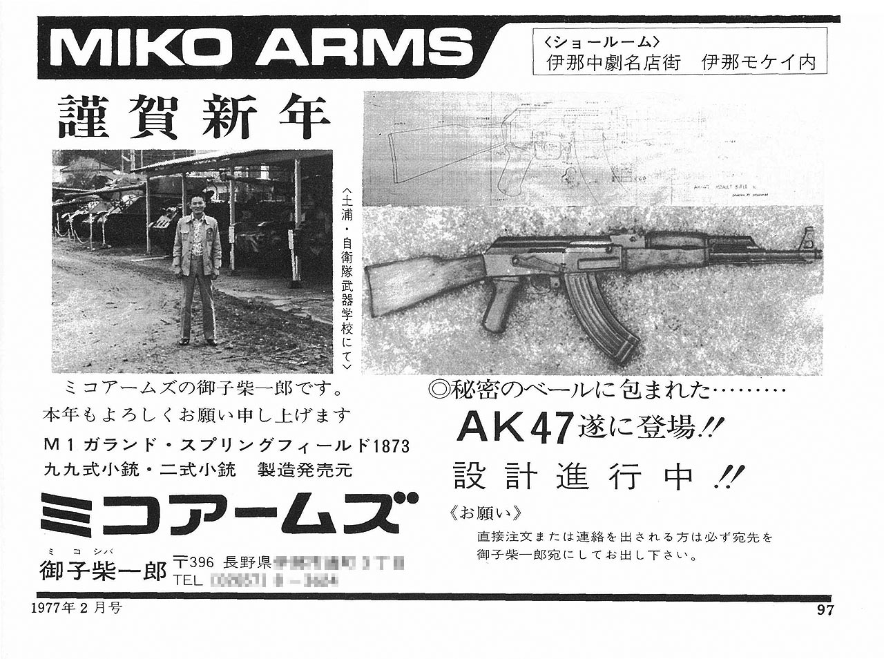 高級鉄製長物モデルガンを作っていたミコアームズさんからAK47が発売されるという1977年2月号の広告です。 試作品と思われる写真の上には設計図が載っています。このAKは、発売されなかったと記憶しています。 すぐに52年規制がやってきて鉄製の長物自体が製造販売できなくなりました。