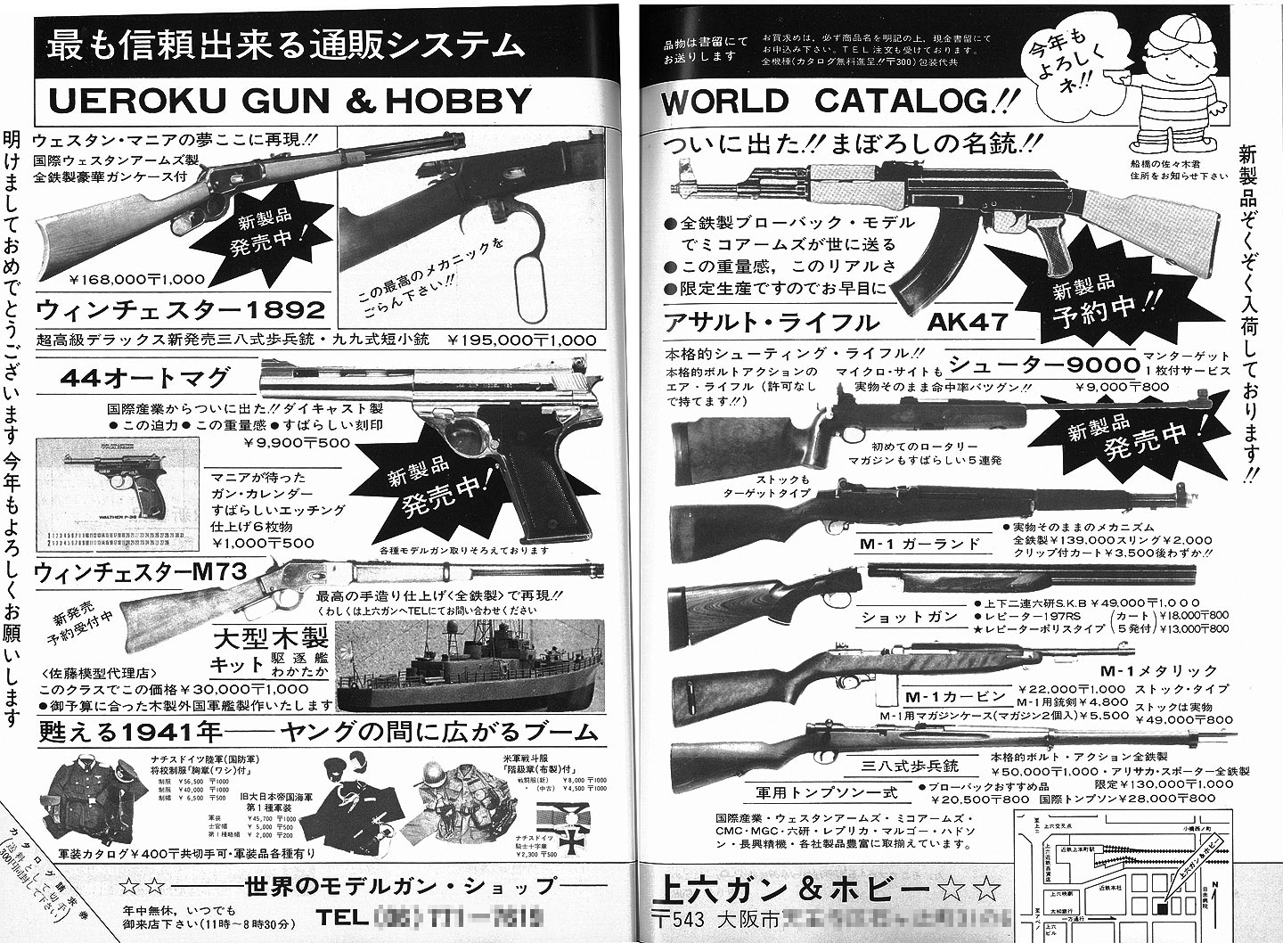 ミコさんが広告した1977年2月号の、上六ガンホビーの広告です。モデルガン絶頂期の鉄製長物の時代をよく表していますね。この中にミコアームズのAKやミコのガーランドが載っています。 また、六研のSKB上下二連なんてのもありますが、こんなの発売されたのでしょうか?私の記憶にはありません。 こんなに謳歌していたので新たな規制も起きてきたのでしょうね。