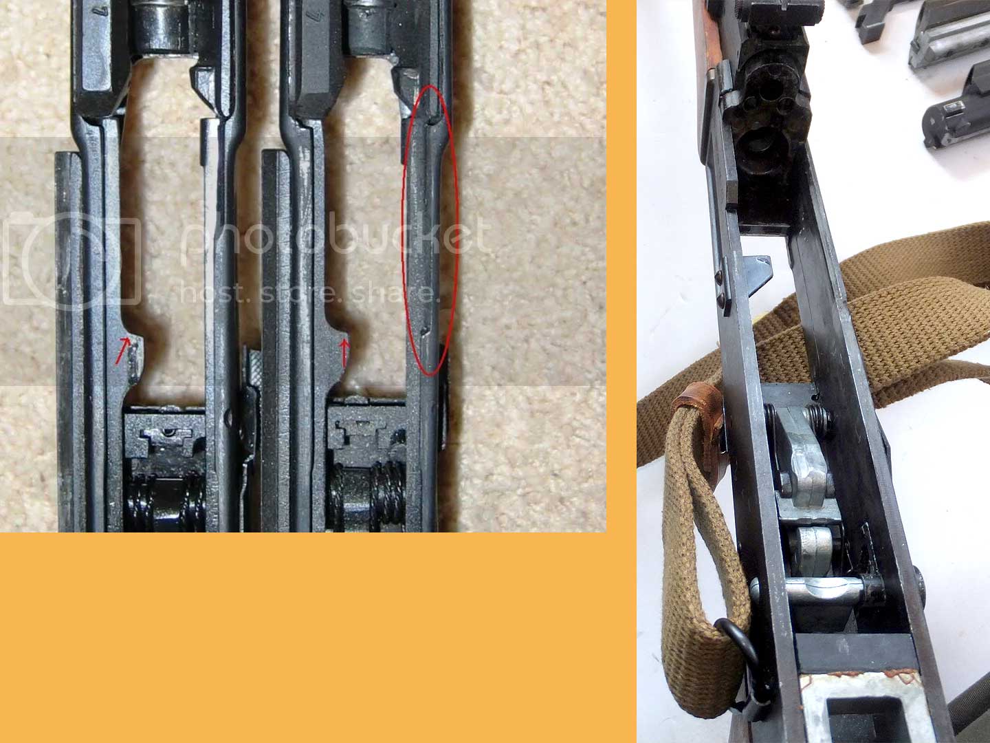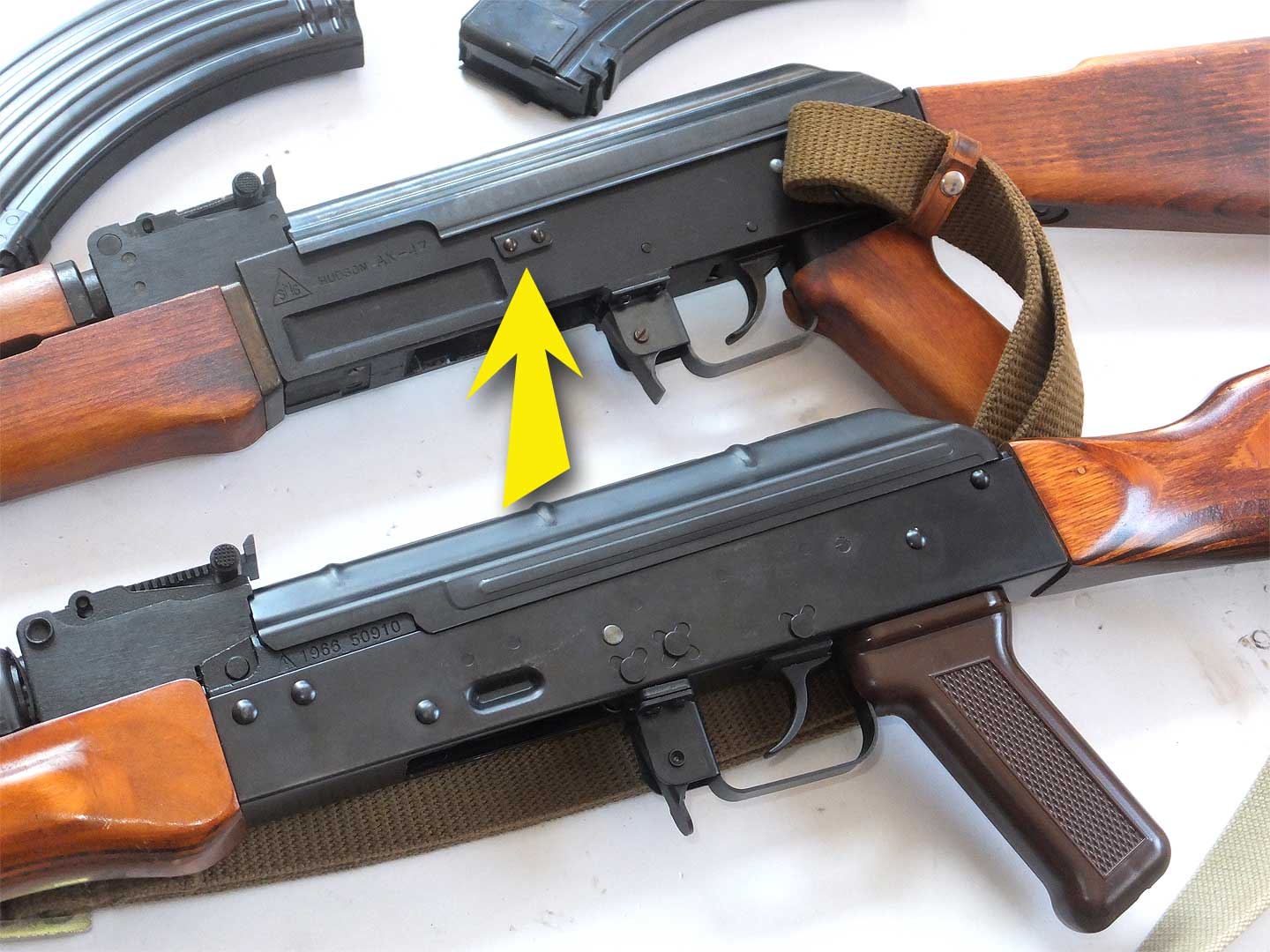 ガスガンのAKMと比較しています。最近の海外製エアソフトガンは、素晴らしい出来栄えでモデルガンも かないません。削り出しのAK47をプレスで製作できるように改良したものがAKMです。上のガスガンのフレームがプレス品になっているのが判ります。