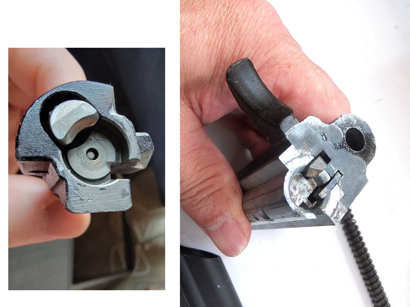 左はネットから取ってきた実銃のボルトです。エキストラクタがでっかいですね。さすが軍用銃って感じがします。 右のハドソンさんは、ピストンを省略したのでコッキングハンドルもボルトに付いています。向かって左側にエキストラクタ、 右に発火用のセンターをずらしたファイアリングプレートが見られます。