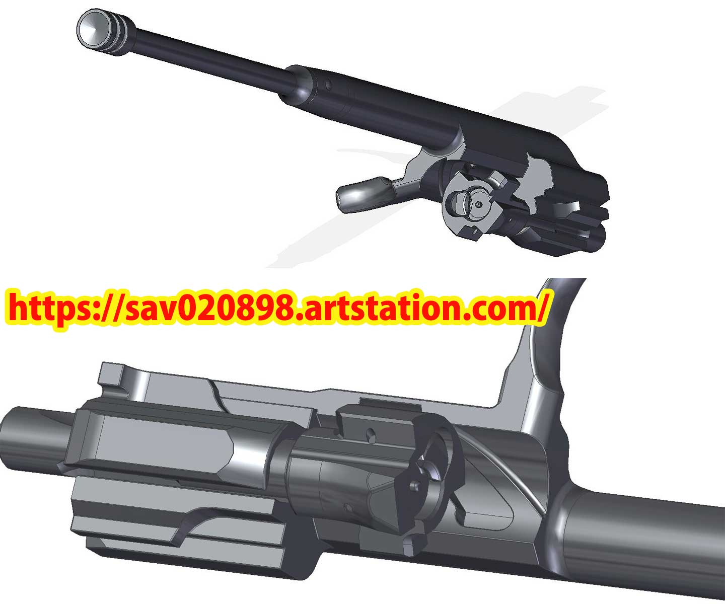 本物はピストンとオペレーティングロッドが一体でコッキングハンドルもそこに付いています。それに回転ロック式のボルトが