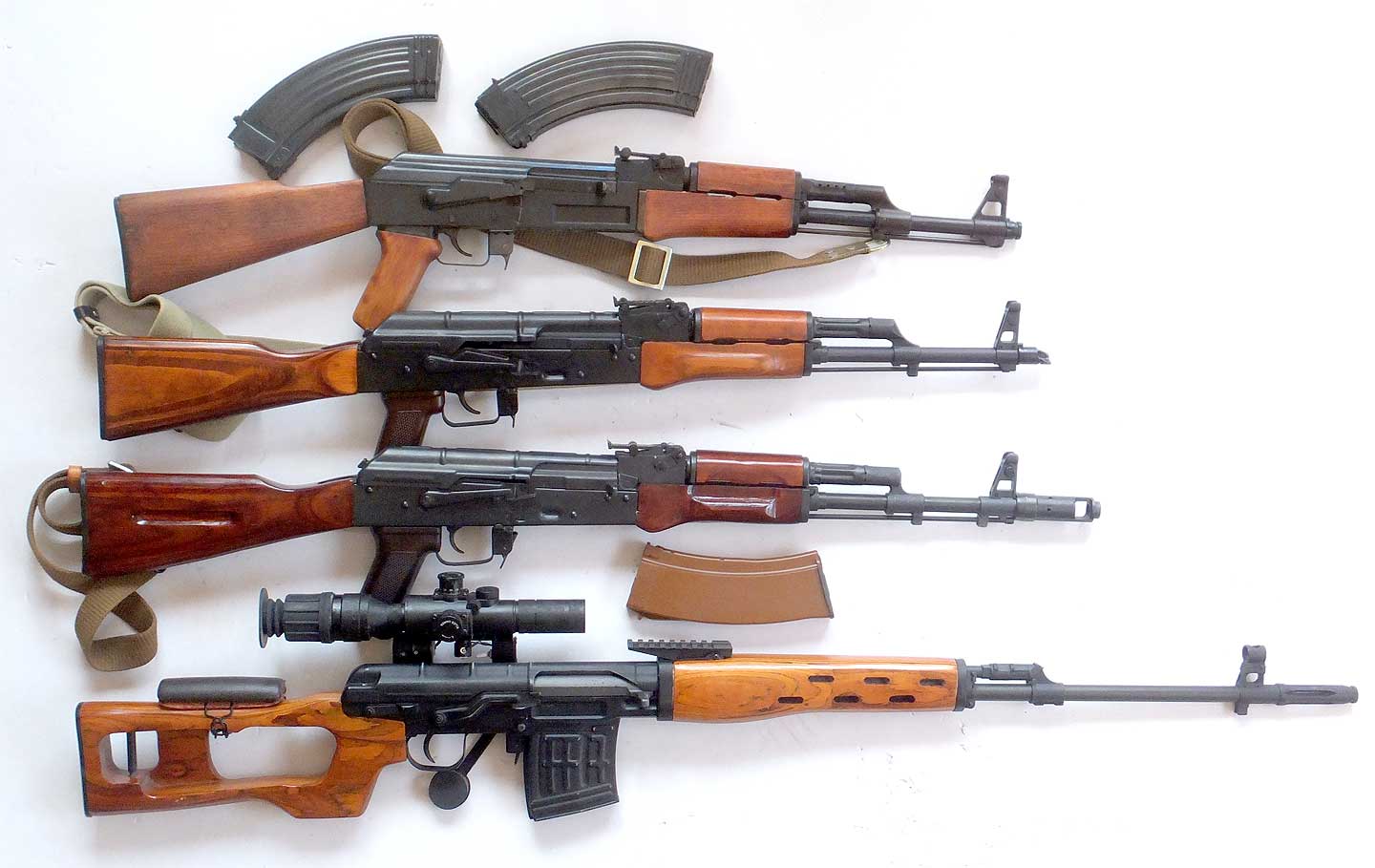 我が家のロシア軍団です。カラシニコフさんの設計ではないのでしょうがドラグノフも同じような形をしています。 写真左は上からハドソン、AKM ガスガン、AK 74電動ガン、エアコキ・ドラグノフです。