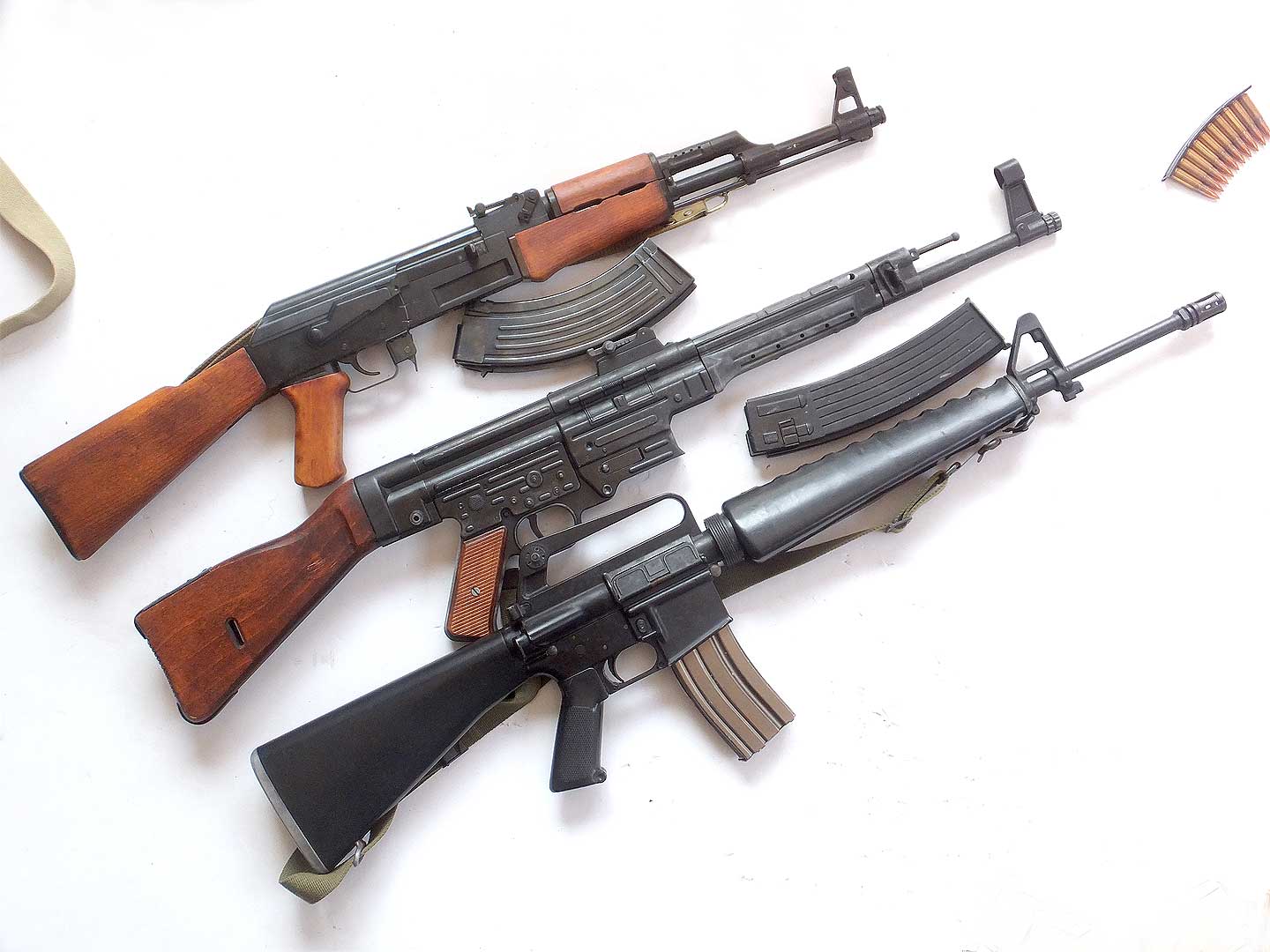 この3機種はよく似ています。また、M16 では排莢孔のフタやヒンジ式の機関部、ストックにまで伸びた、リコイルスプリングなども