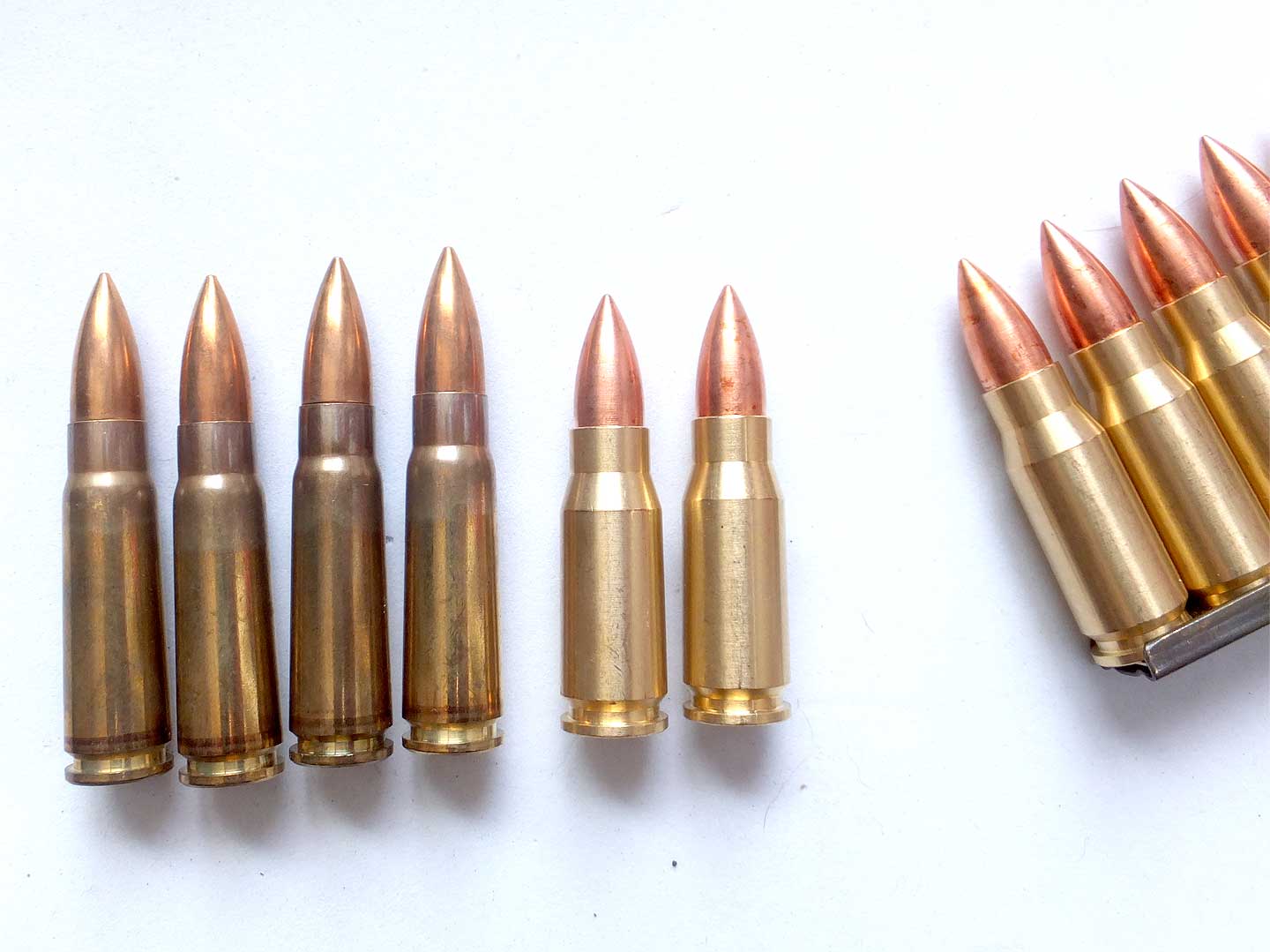 写真右は、左からダミーカートでM-16 用 5.56o弾、AK 74用 5.45o、AK47用 7.62x39、ドラグノフ用 7.62x54R。 ドラグノフの弾は、むかしのモシンナガン小銃の弾なので、2次大戦後から現在に至る小口径化が見て取れます。
