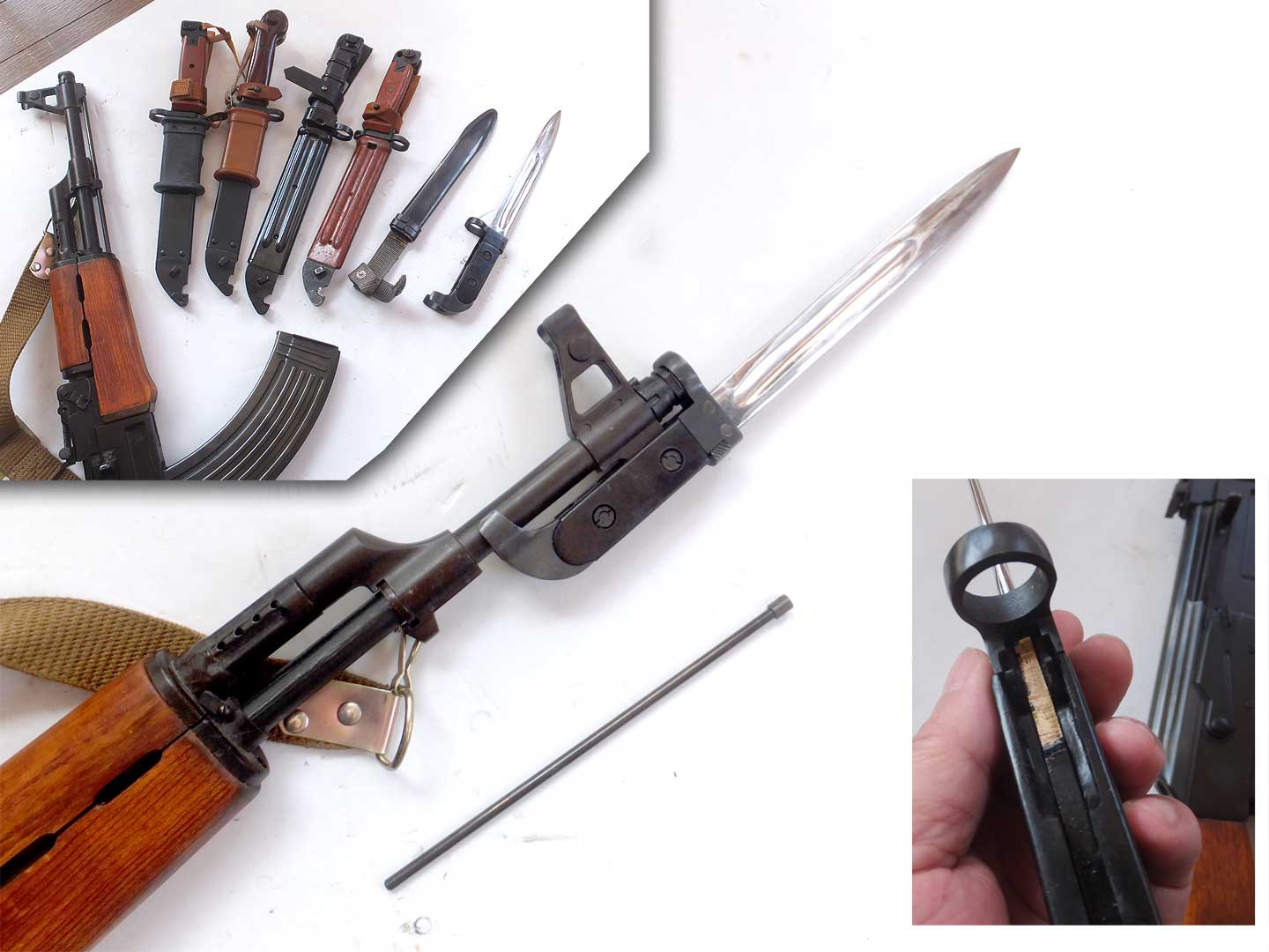 このようにAK47 には、もともと着剣装置が付いていません。ドイツのMP44 も試作機にはあったのに製品版では省かれました。もう白兵戦なんか無いでしょう、との発想でしょうか?しかし、現代では着剣ラグがある小銃がほとんどです。使うことは無いでしょうが、兵士の精神的安定さを考えているのかもしれません。