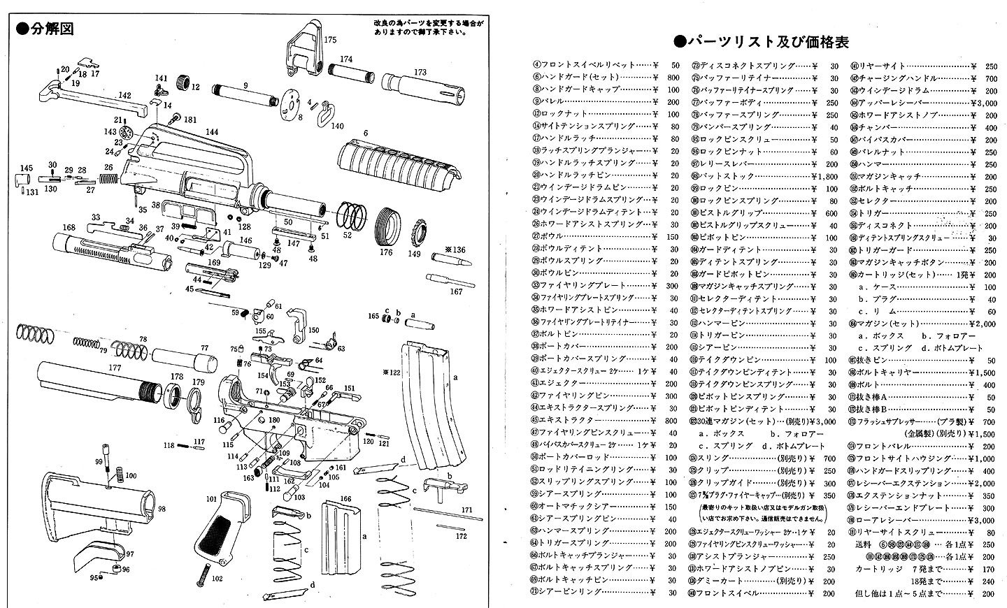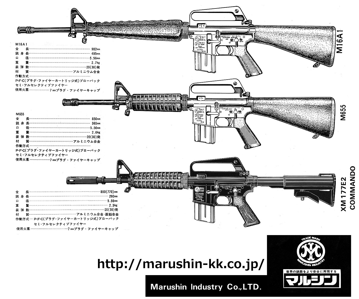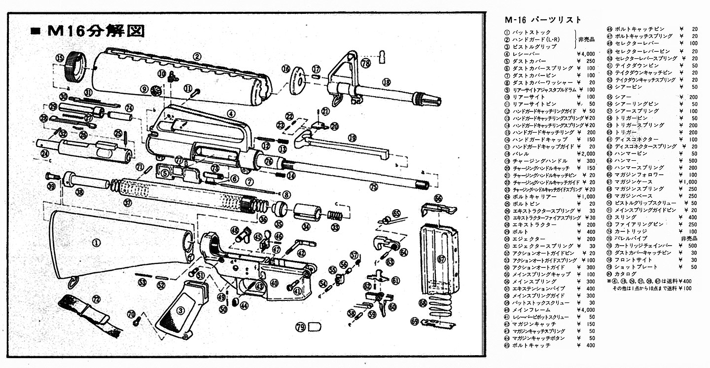 マルシンのカタログより(昭和50年頃?)。上記の登場価格よりも安いですね。 実は、登場したころは実物のハンドガード、ストックが使用されていました。そちらが 24,000円で その後、国産パーツ使用の物が 19,500円で販売されました。